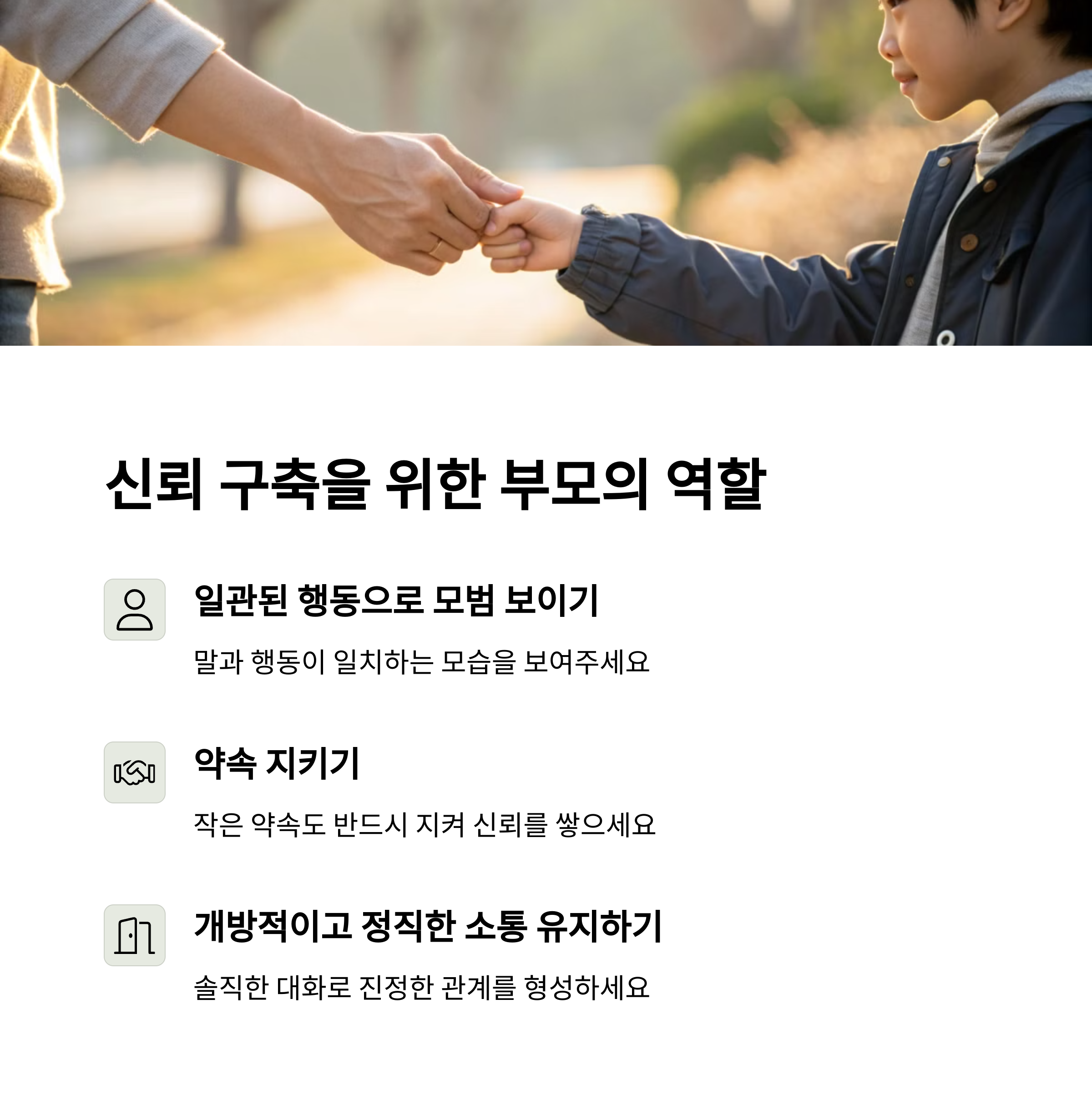 | 부모의 역할 | 부모로서의 역할과 자녀와의 신뢰 구축을 다룹니다. |