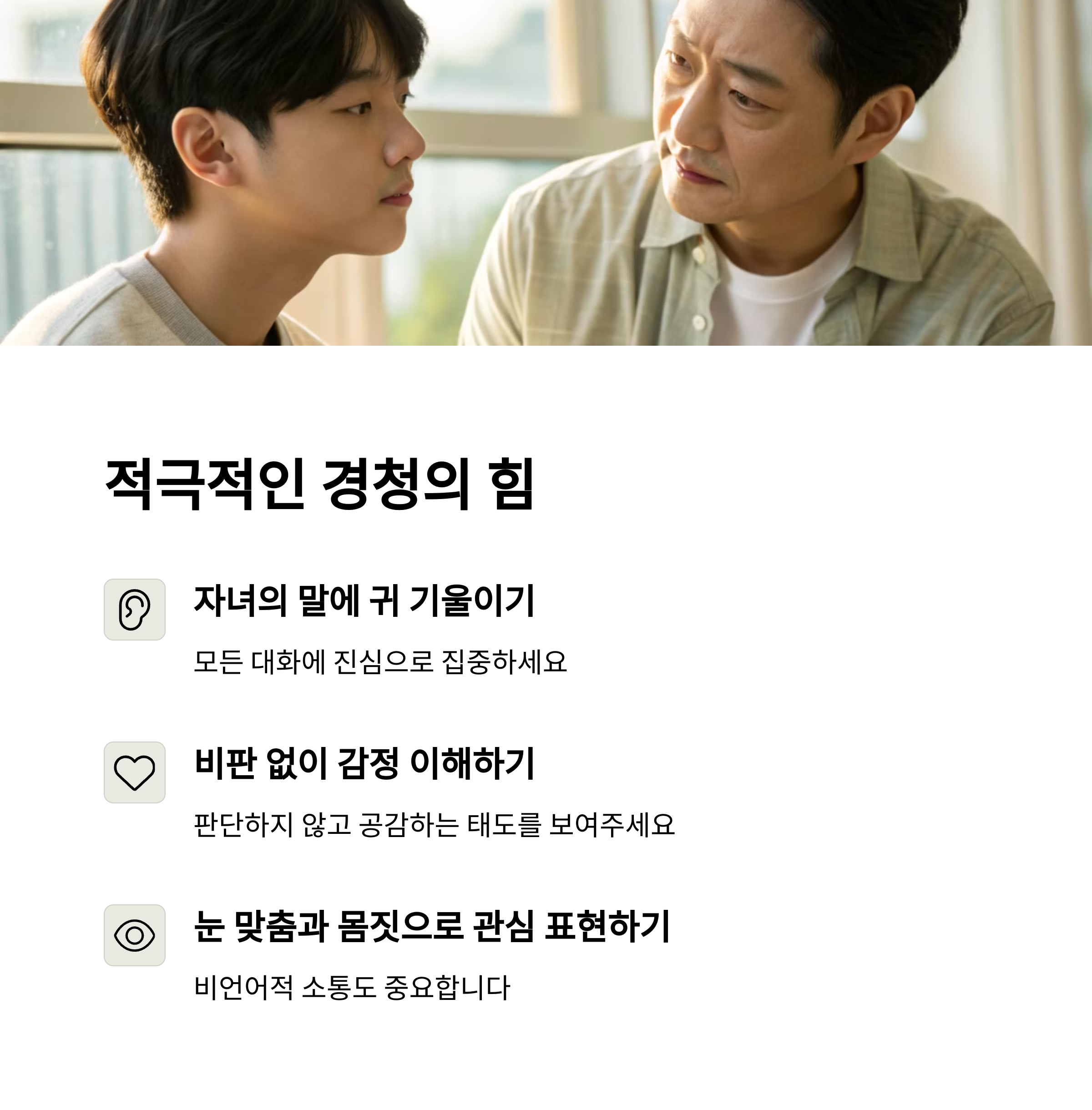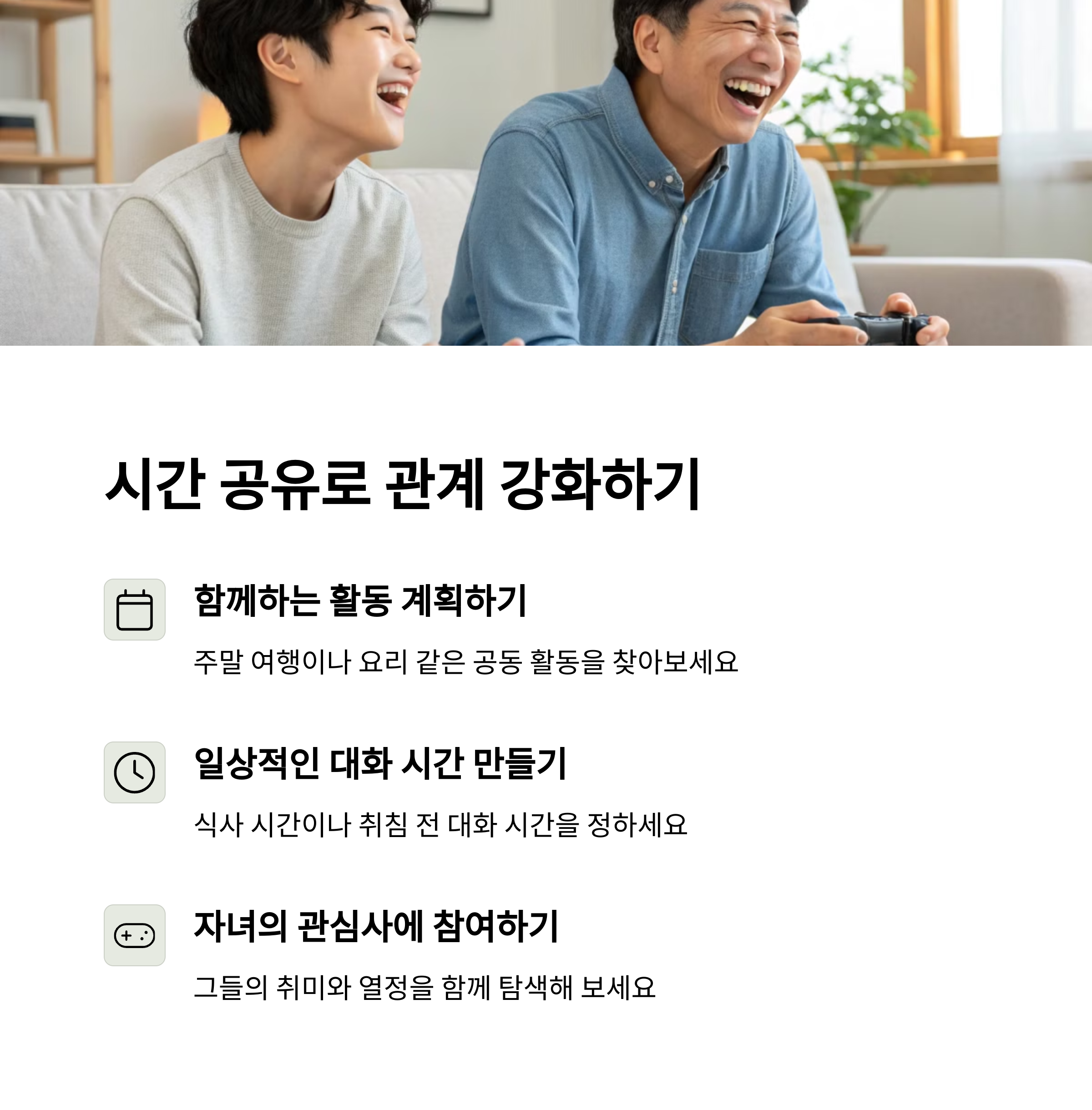| 자녀가 말하는 것에 집중하고, 공감하는 자세. | 자녀가 좋아하는 활동에 함께 참여하는 방법. | 자녀가 한 일에 대해 칭찬하고 격려하는 방법. |
