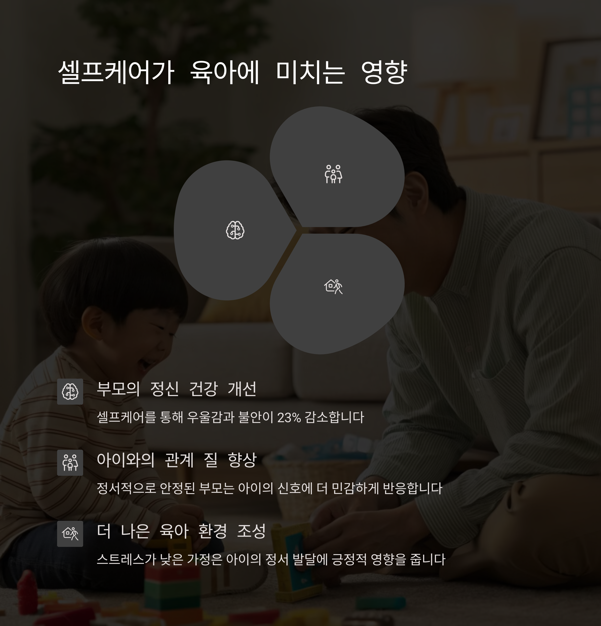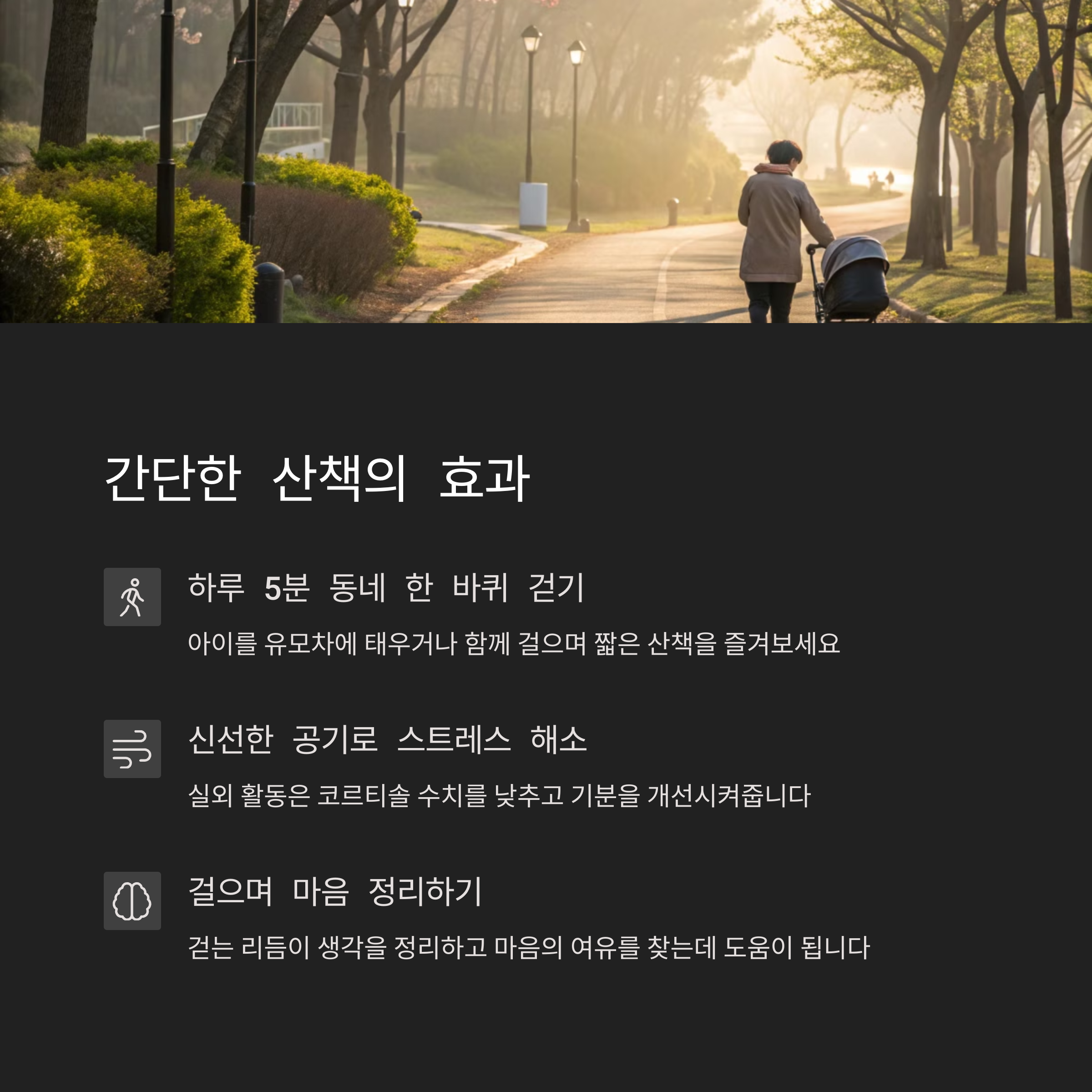 | 신체 활동과 휴식이 결합된 셀프케어입니다. | 짧은 시간에도 효과적으로 스트레스를 해소합니다. | 육아 스트레스 관리는 가족의 행복을 위해 중요합니다. |