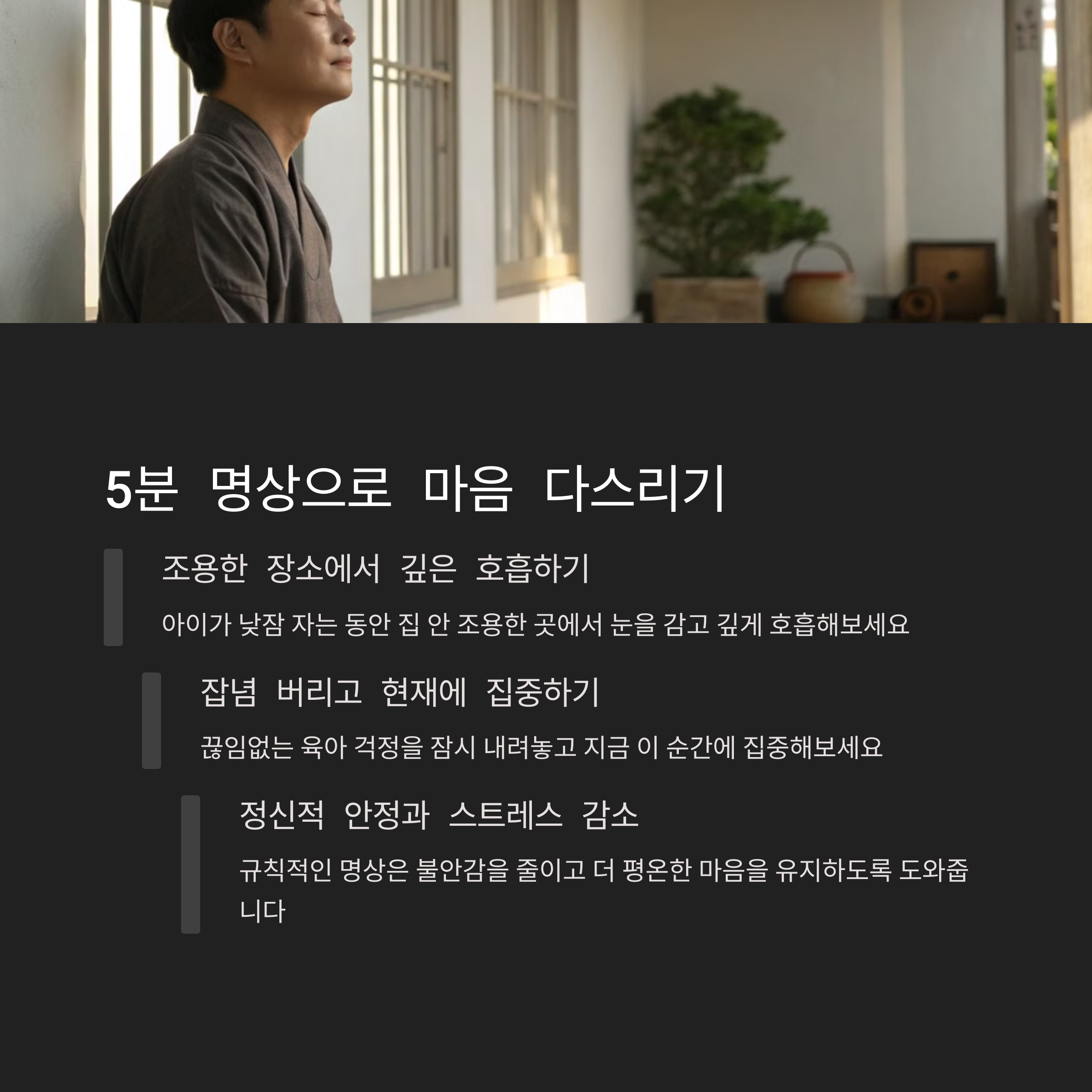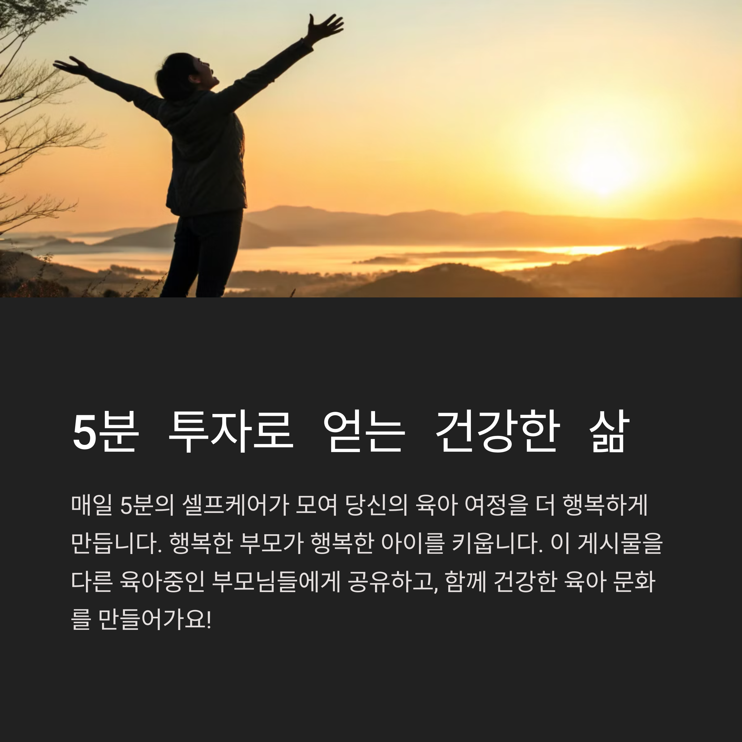 | 하루 5분의 자기 관리가 중요합니다. | 정신적인 피로를 덜어내기 위한 방법입니다. | 육아 중에도 쉽게 실천할 수 있는 방법들입니다. |