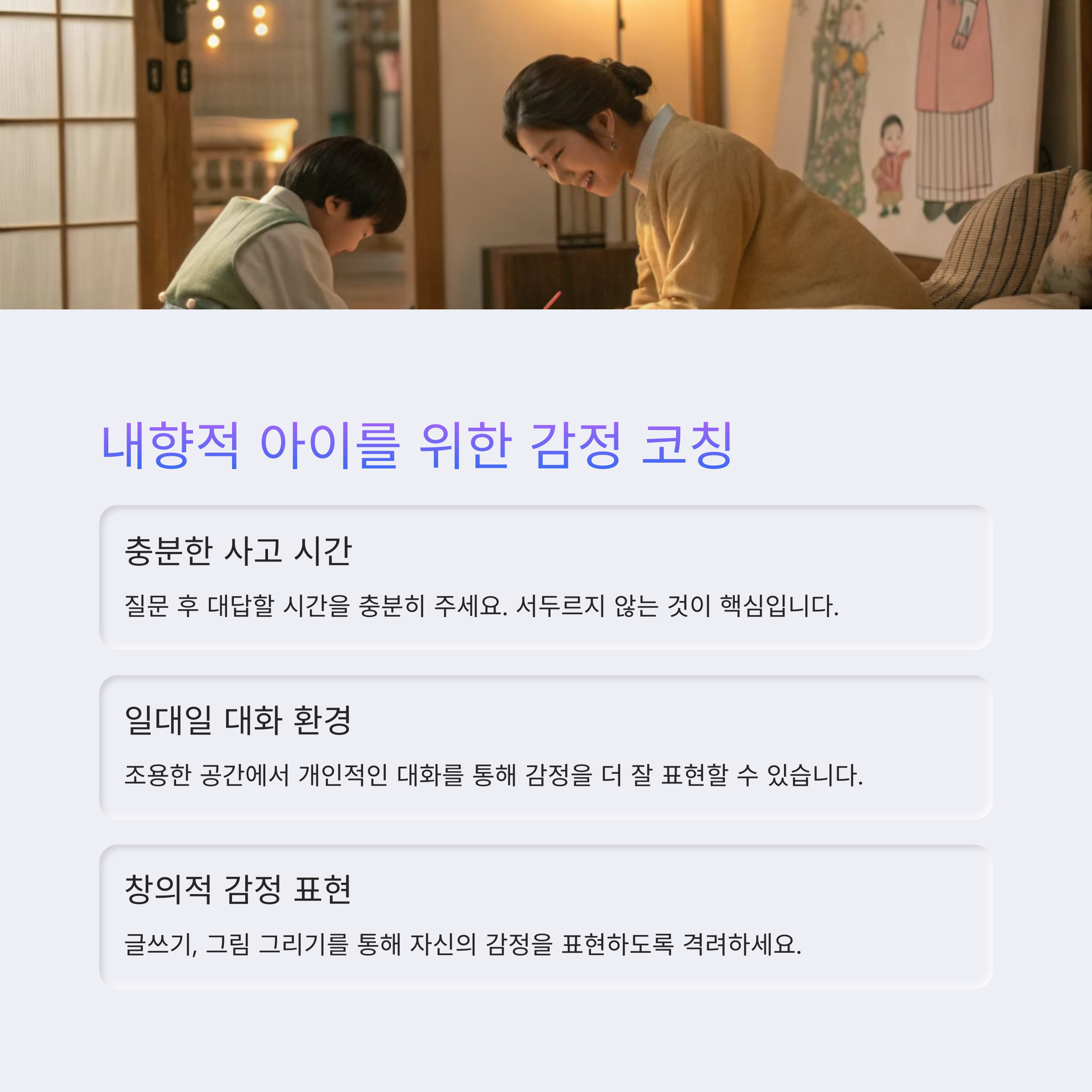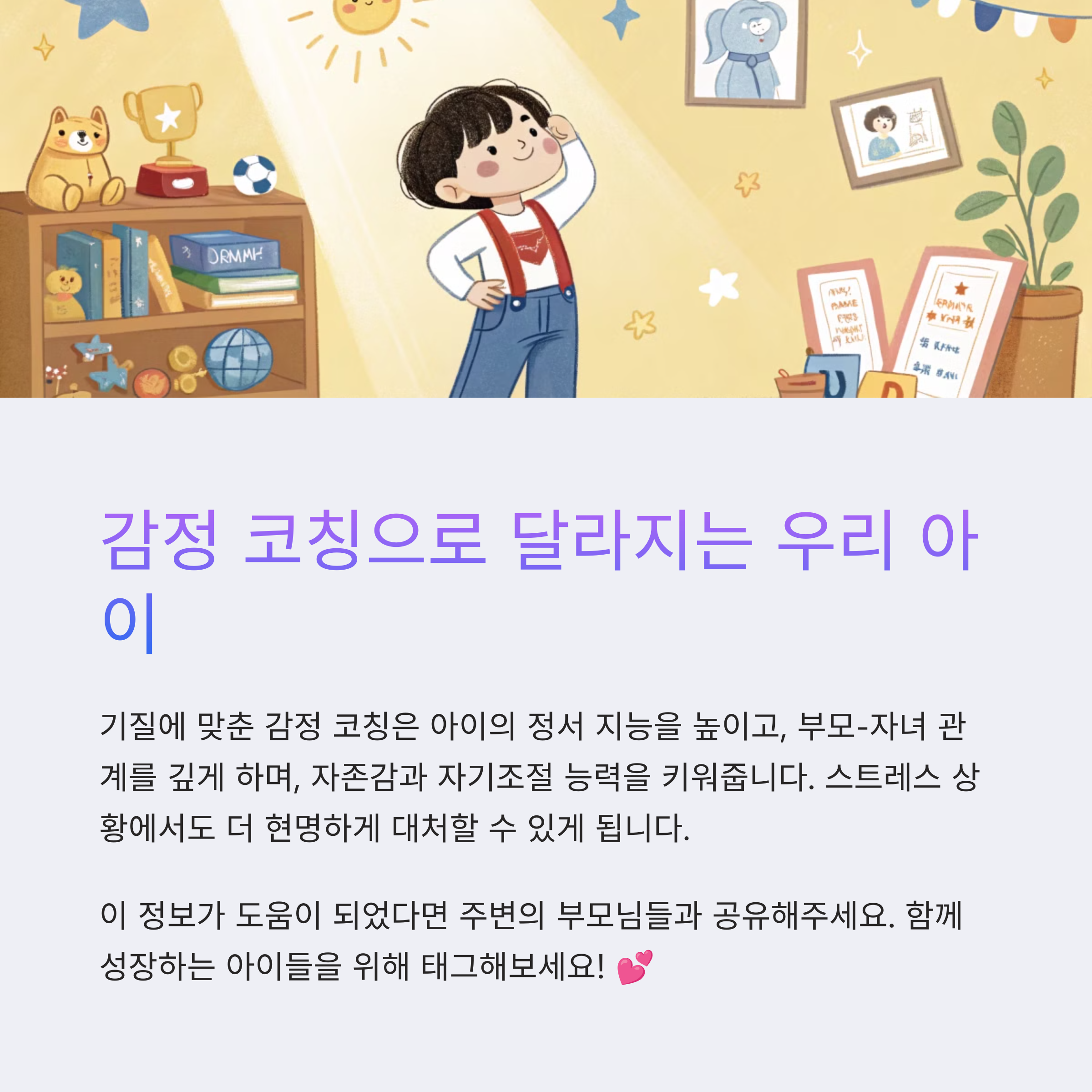 | 감정 코칭의 중요성 | 감정 코칭은 아이의 감정 조절을 돕고 관계를 개선하는 중요한 방법입니다. |