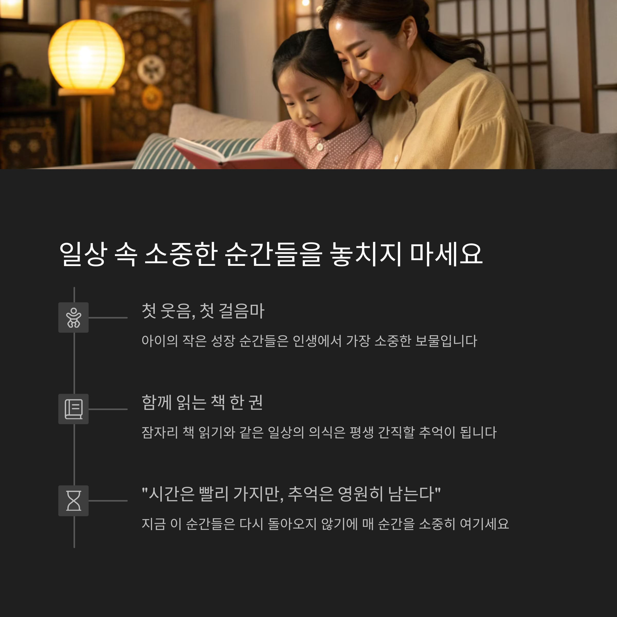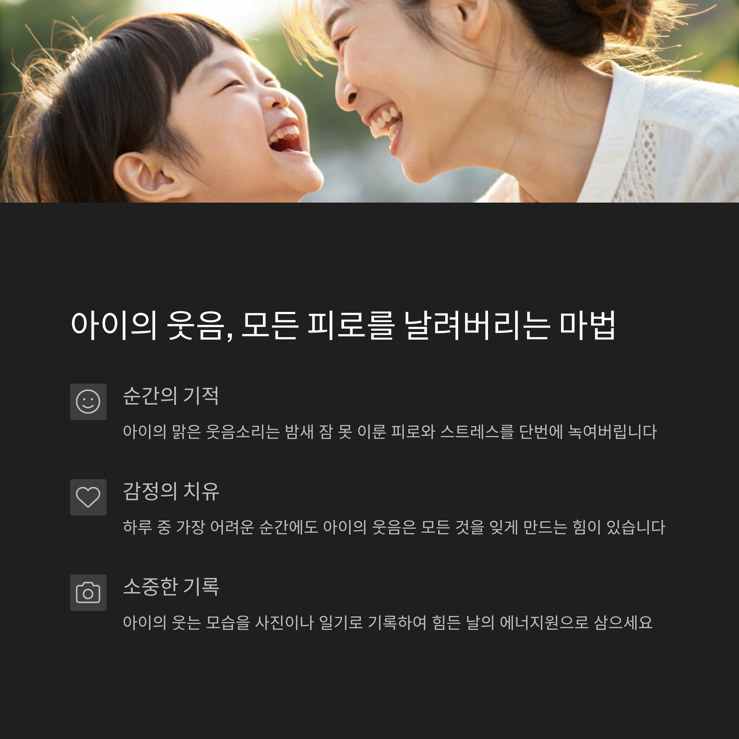 | 육아 명언 1 | "아이와 함께하는 시간은 단순히 길어 보일 뿐, 지나고 보면 그 순간들이 정말 소중하다." |