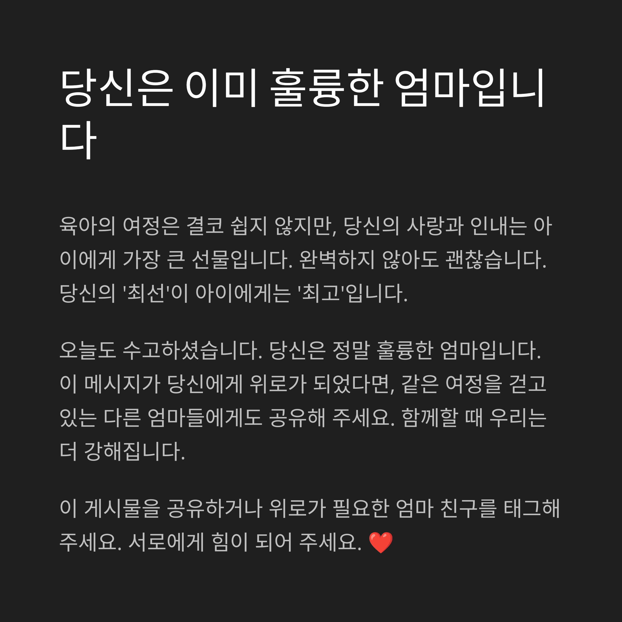 | "아이와 함께하는 시간은 단순히 길어 보일 뿐, 지나고 보면 그 순간들이 정말 소중하다." | "모든 엄마는 자신의 아이에게 최선을 다하고 있다는 걸 잊지 말자." | "엄마는 결코 혼자가 아니다. 서로 함께 힘을 합쳐 이겨내자." |