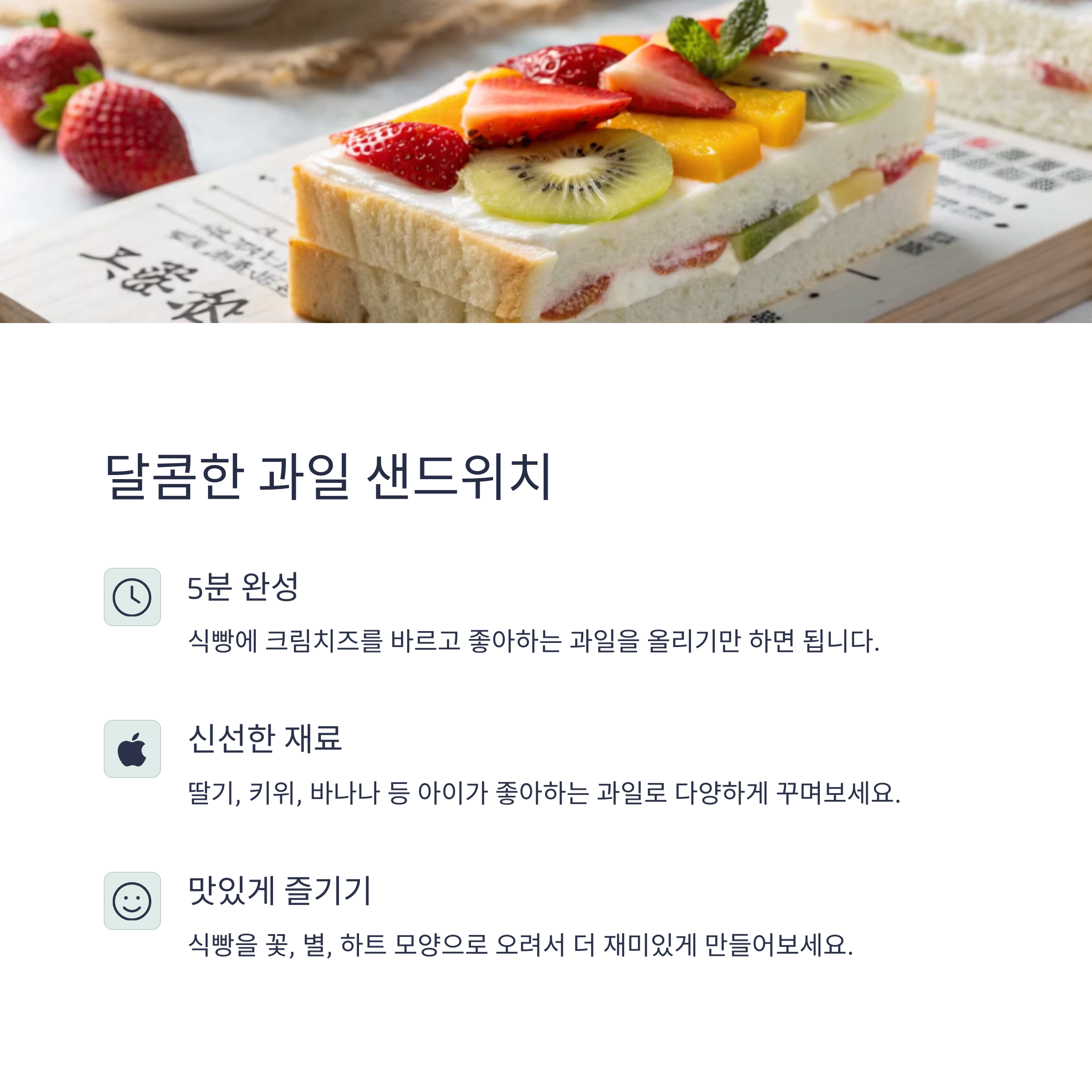 | 쉽게 준비 가능한 간식 | 달콤한 맛과 재미있는 만들기 과정 | 아이들이 쉽게 먹을 수 있는 건강 간식 |