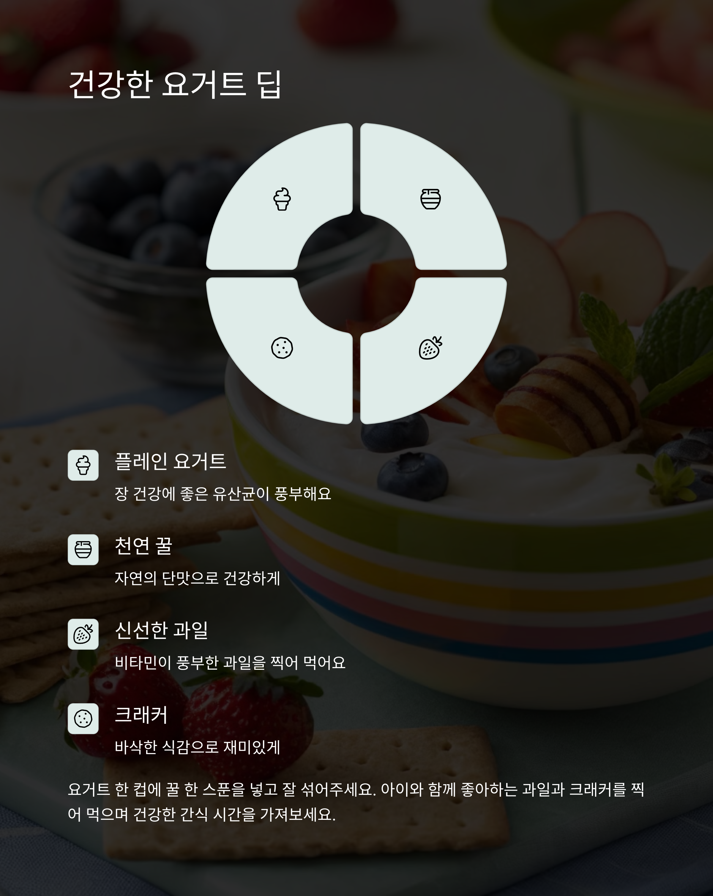 마지막 레시피는 요거트 딥입니다. 요거트와 꿀, 그리고 좋아하는 과일을 곁들여 만드는 요거트 딥은 아이들이 손쉽게 먹을 수 있는 간식입니다. 간단하게 준비할 수 있으며, 건강한 간식으로 아이들에게 좋은 선택이 됩니다. 아이와 함께 과일을 다듬고, 요거트를 섞으며 맛있는 간식을 만들어 보세요.