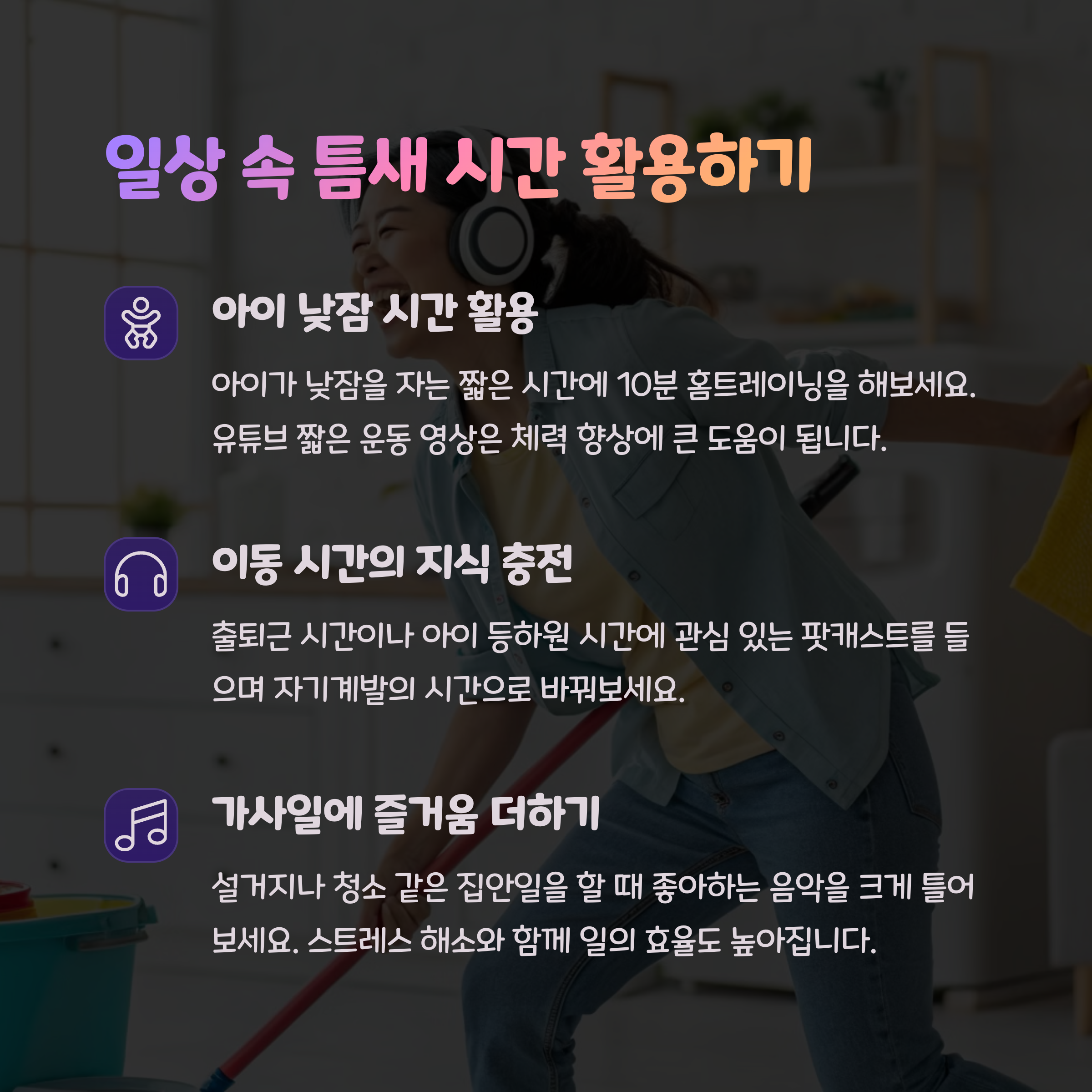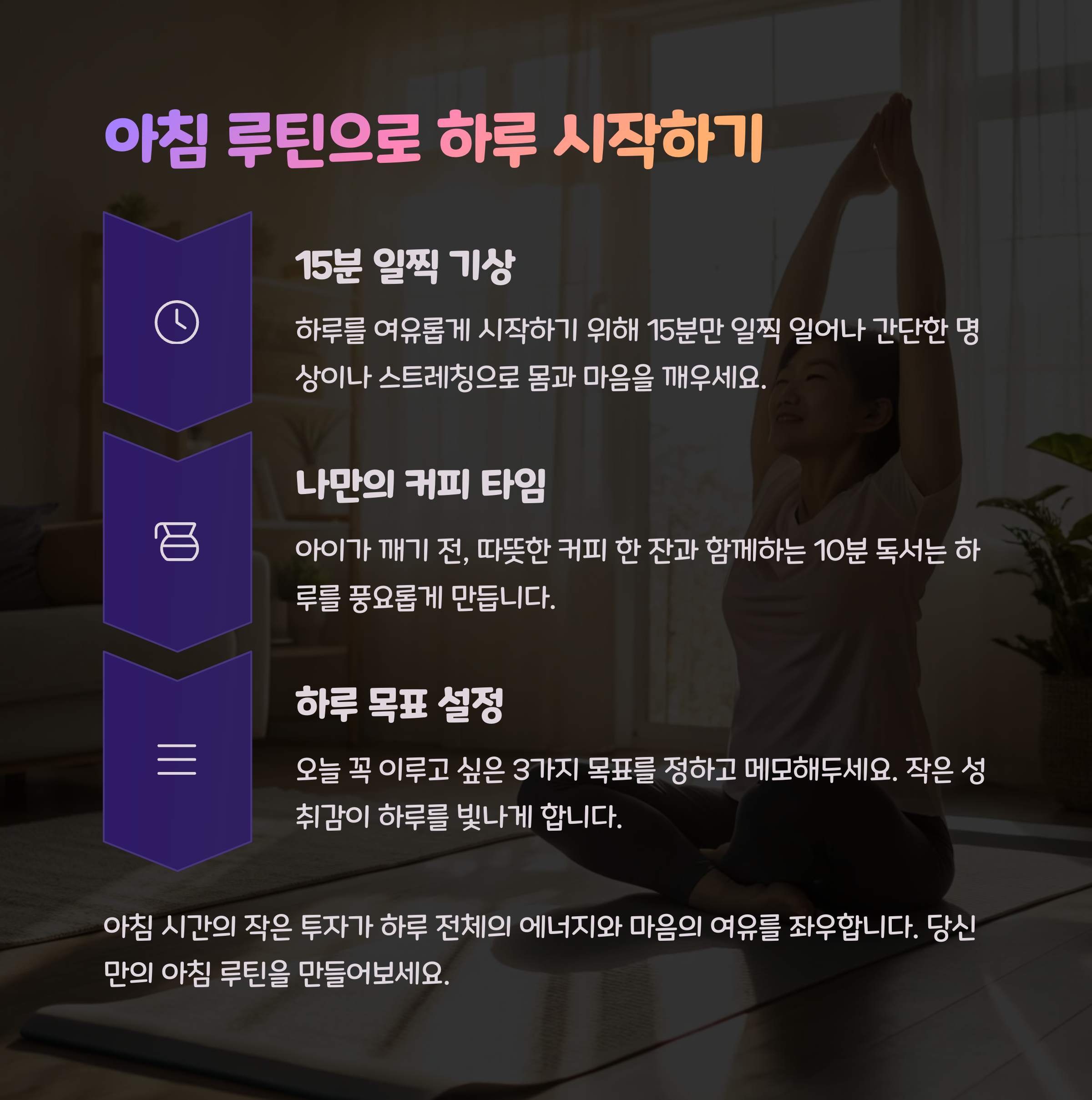 | 엄마 루틴 | 엄마들도 규칙적인 루틴을 만들어 나만의 시간을 가질 수 있어야 합니다. 일정한 루틴으로 시간을 관리하는 법을 알아보세요. |