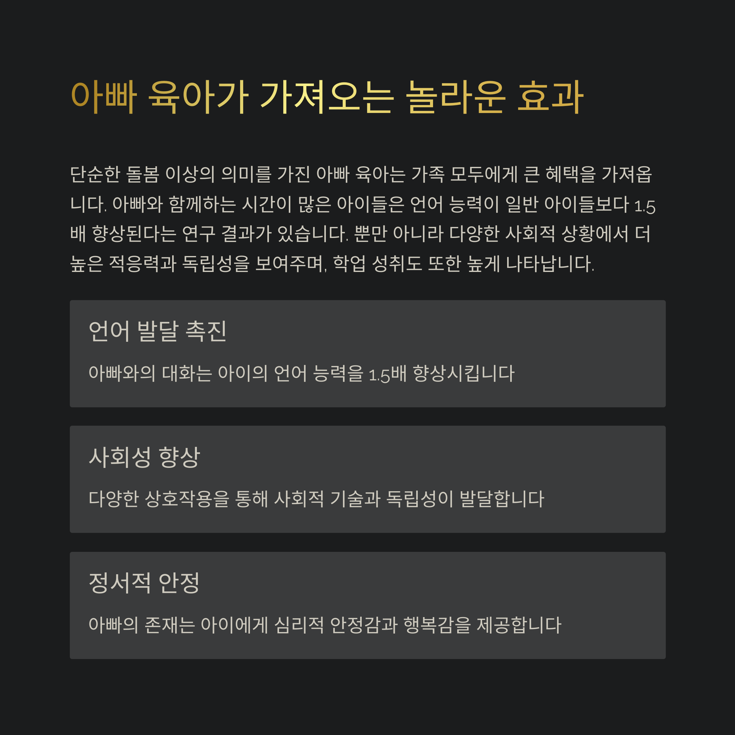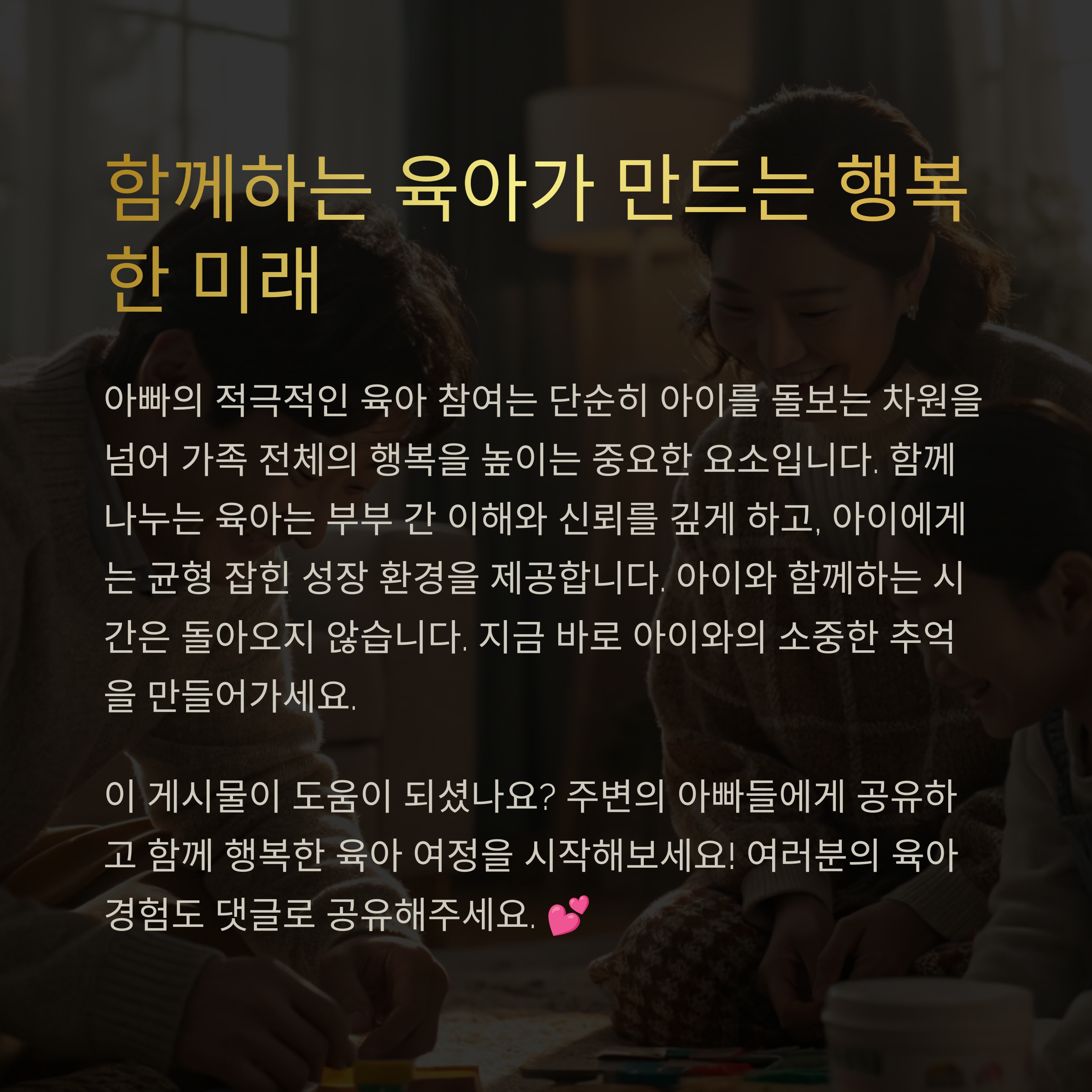 아빠 육아는 단순한 역할 분담이 아닙니다. 아빠와 아이가 함께하는 시간은 가족의 유대감을 더욱 강화하고, 아이에게 건강한 정서적 성장을 돕는 중요한 시간입니다. 아빠가 육아에 참여하는 것은 가정의 행복을 더하는 가장 중요한 요소입니다. 가족 모두가 더 행복하고 건강한 삶을 살 수 있도록, 아빠 육아에 적극적으로 참여하세요.