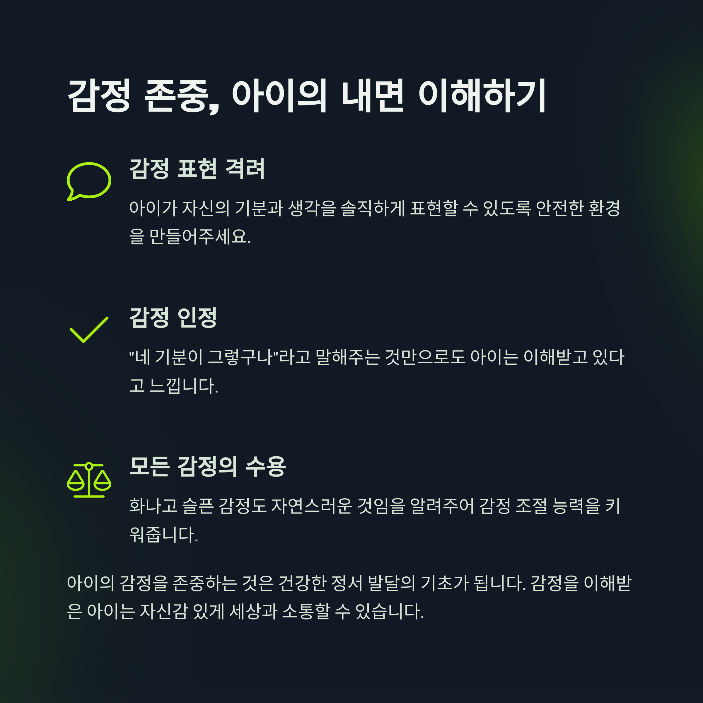 | 소통을 통해 아이는 스스로의 감정을 이해할 수 있습니다. | 부모는 아이의 감정을 존중하고 안정감을 주어야 합니다. | 아이와의 대화에서 부모는 열린 마음을 가져야 합니다. |