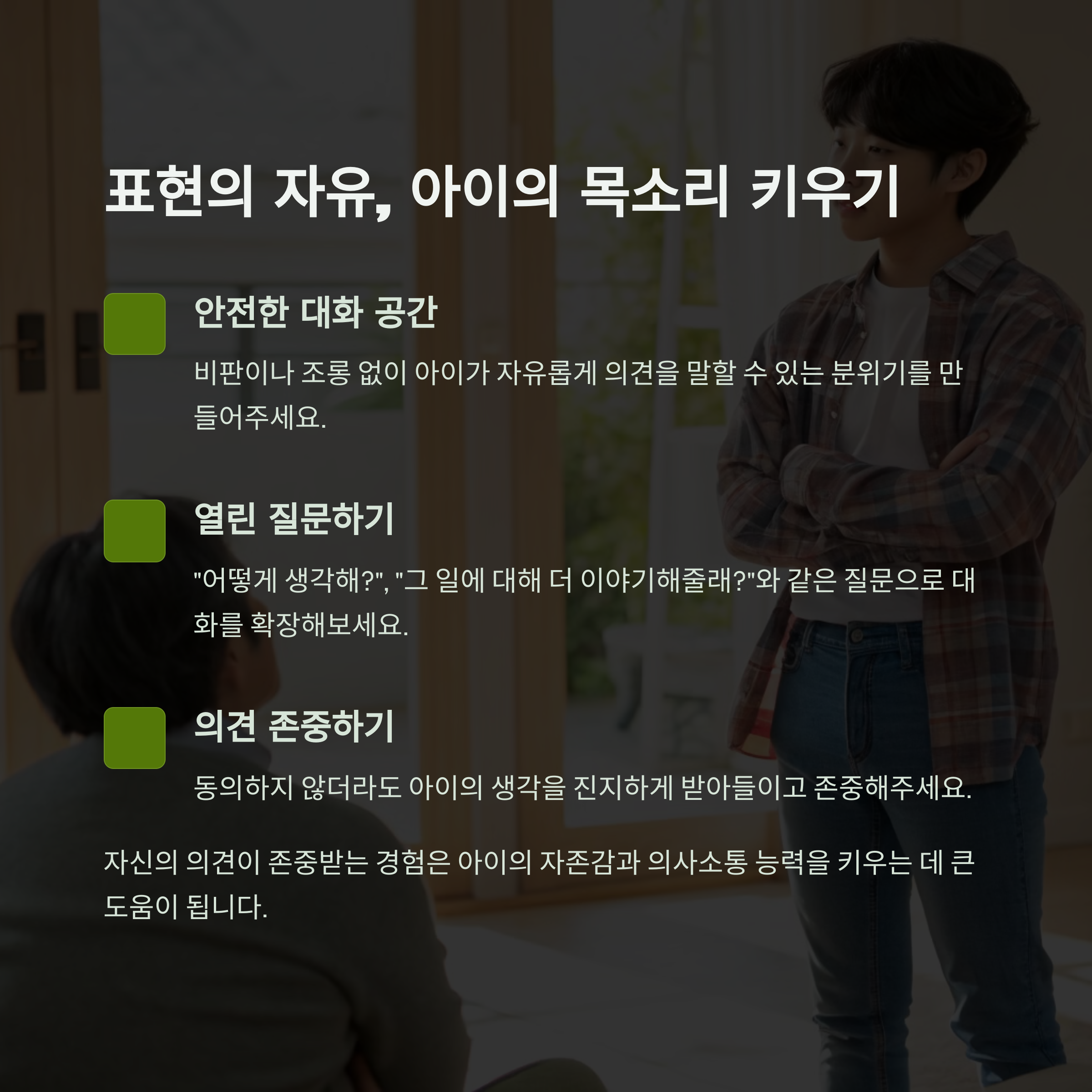 부모와 자녀 간의 소통에서 가장 중요한 것은 존중과 신뢰입니다. 아이가 생각을 자유롭게 표현할 수 있도록 부모는 아이의 의견을 존중해야 하며, 아이의 감정을 이해하려는 노력이 필요합니다. 또한, 부모가 아이와의 대화에서 일관되게 신뢰를 쌓아간다면, 아이는 부모와의 관계를 더욱 중요하게 생각하게 될 것입니다.