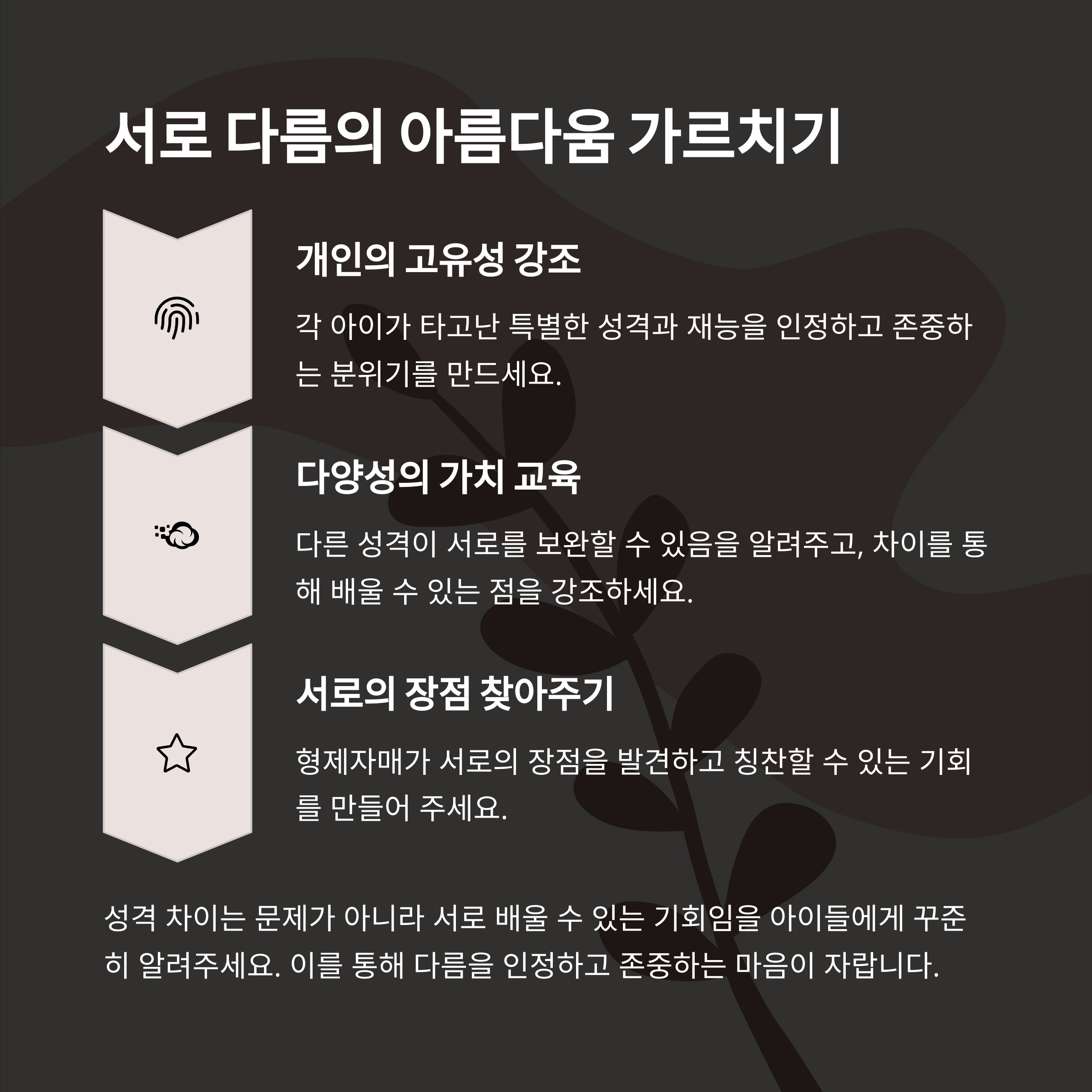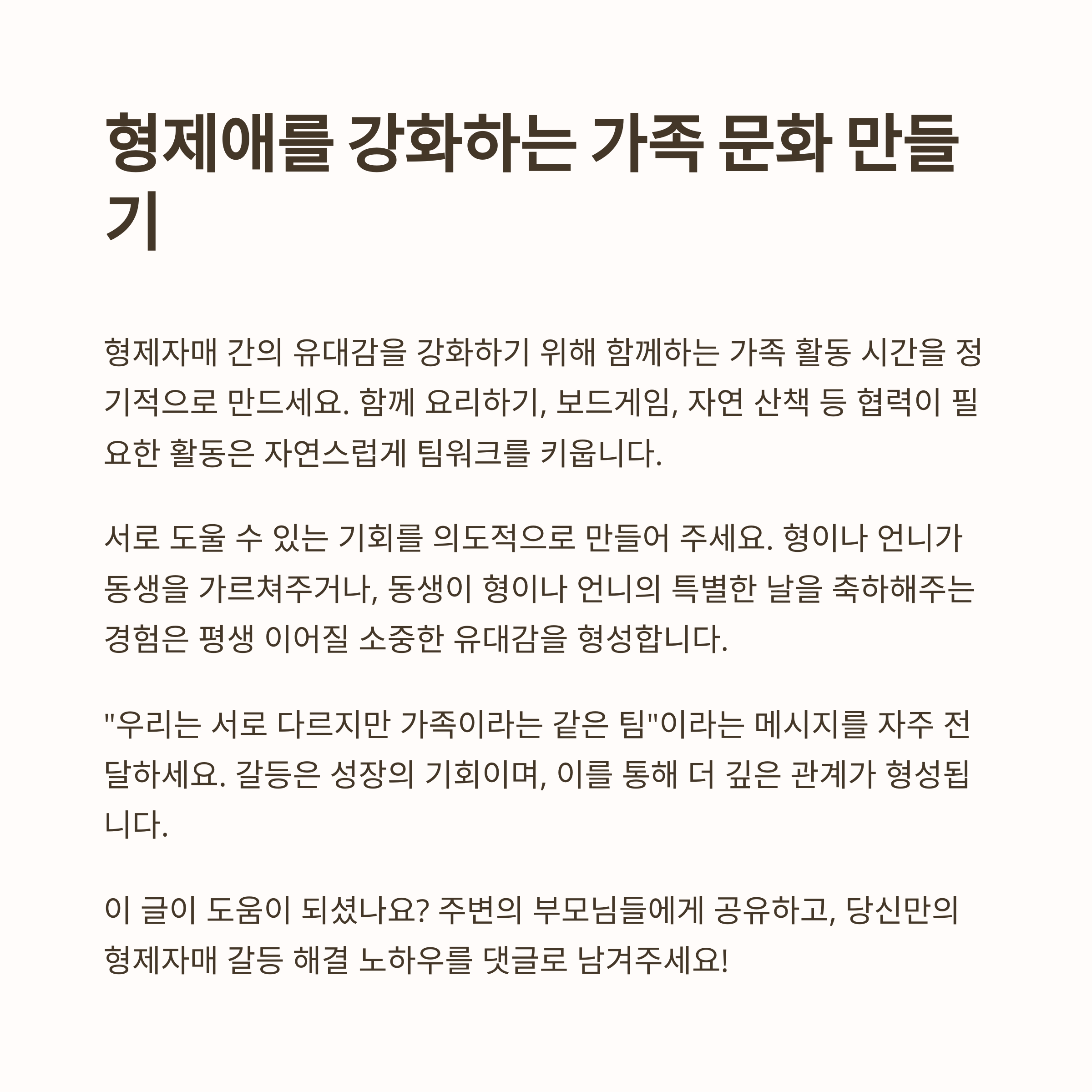 | 긍정적 갈등 경험이 사회성으로 연결 | 공감은 형제 관계의 회복 열쇠 | 신뢰를 높이는 일관된 부모의 태도 |