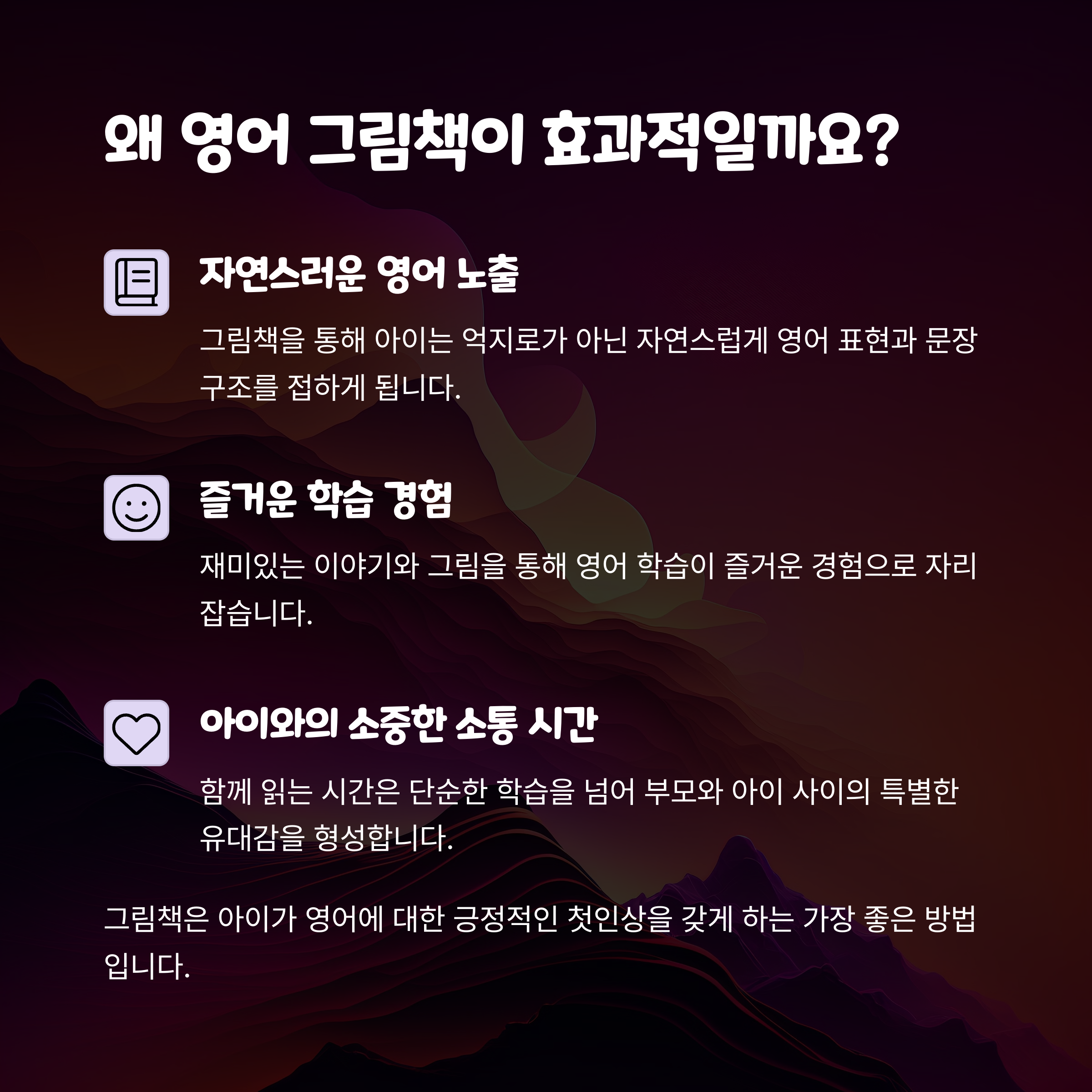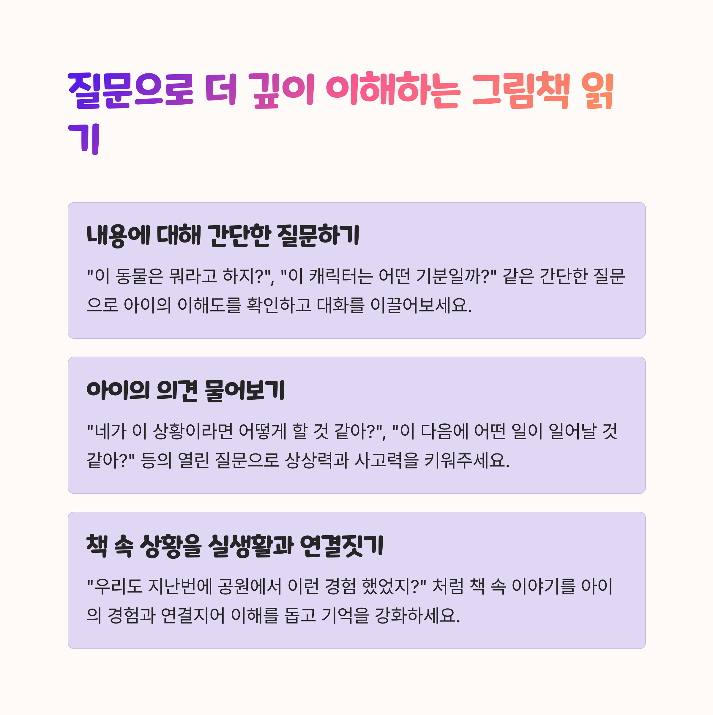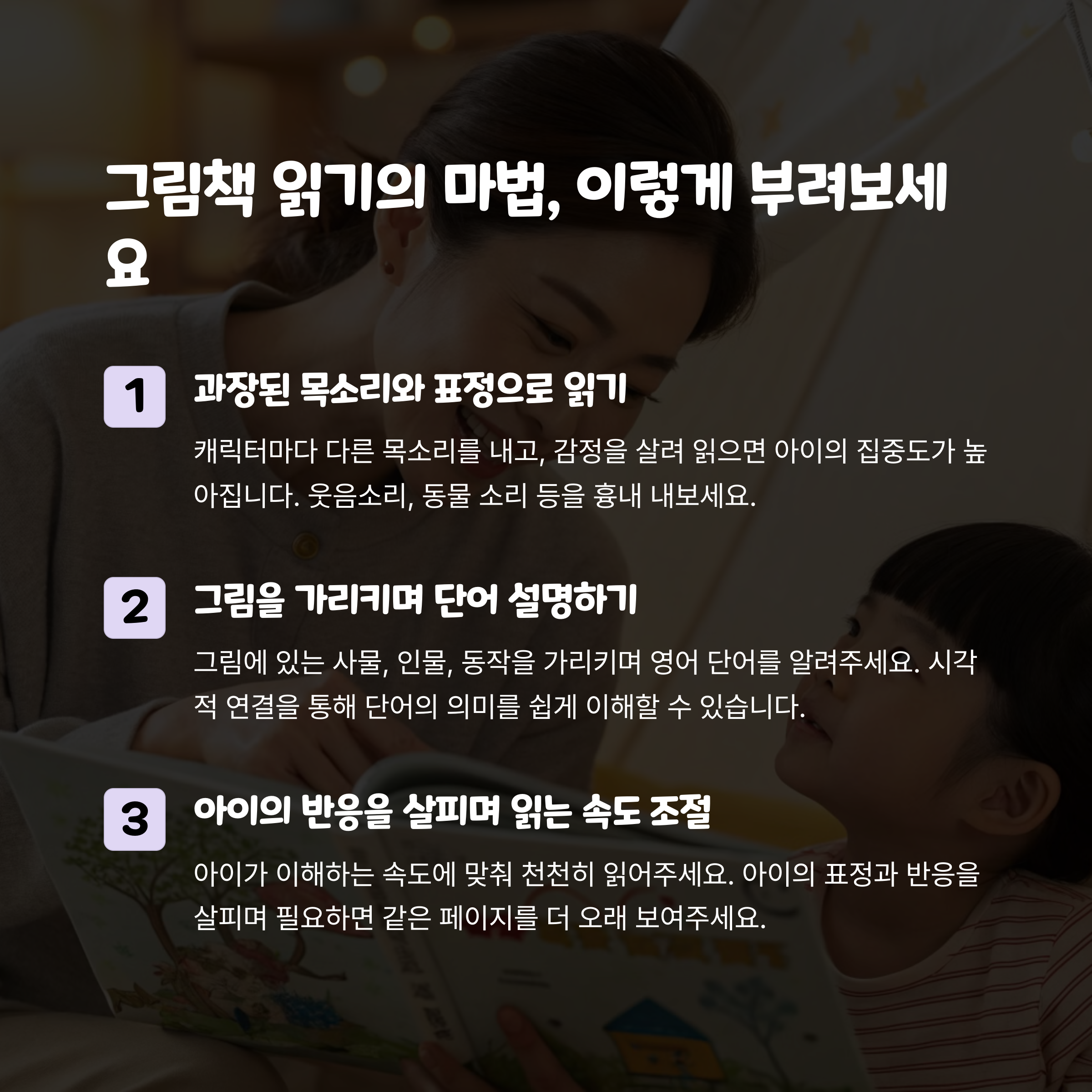 | 아이의 수준에 맞는 책을 선택합니다. | 매일 정해진 시간에 책을 읽어주는 것이 중요합니다. | 아이의 반응을 살피며 질문을 던져보세요. |