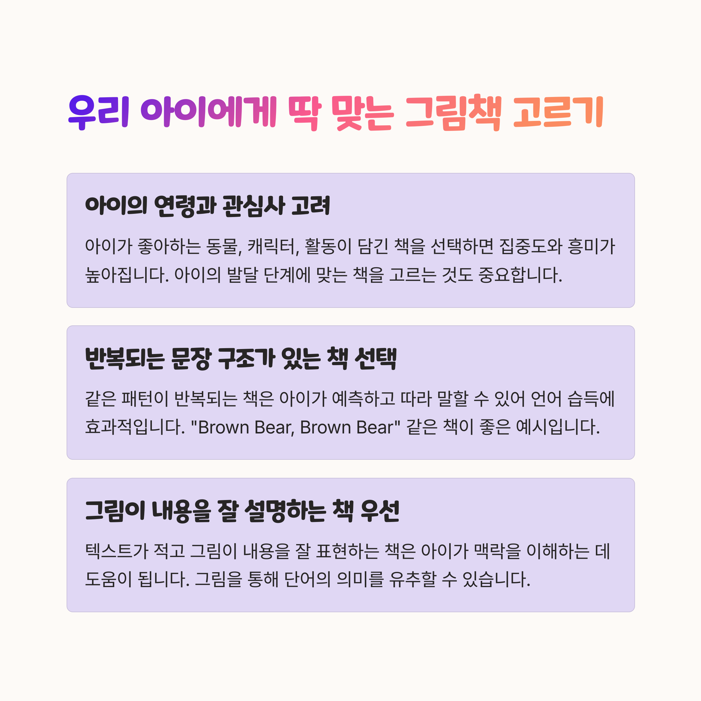 | 그림책의 주제와 이야기를 고려해 선택합니다. | 꾸준히 읽을 수 있도록 환경을 만들어주세요. | 아이와의 소통을 통해 책을 더욱 재미있게 만듭니다. |
