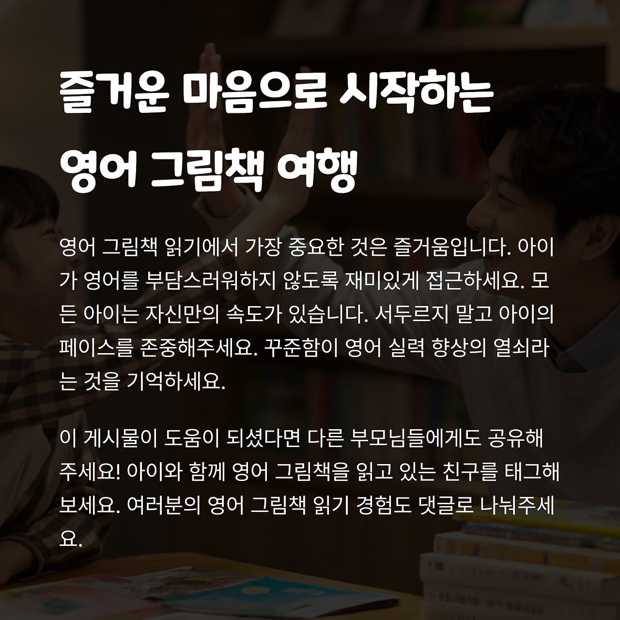 | 영어 그림책 고르기 | 처음에는 짧고 쉬운 문장으로 구성된 책을 선택하세요. |
