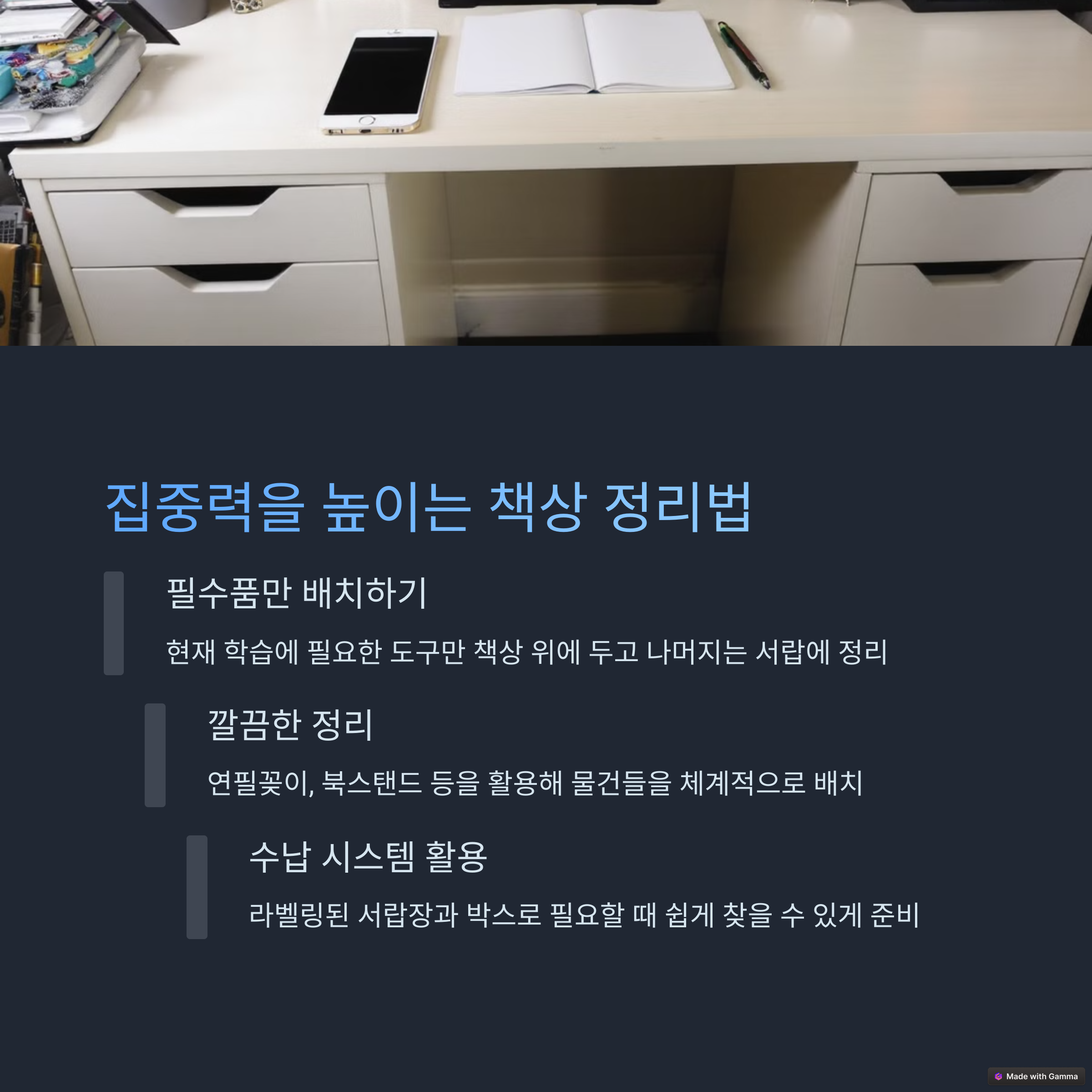 아이의 집중력 향상에는 책상 배치도 매우 중요합니다. 책상은 아이가 편안하게 앉을 수 있는 높이와 각도를 유지해야 하며, 공부할 때 필요한 물건들만 가까이 두는 것이 좋습니다. 이렇게 하면 불필요한 이동을 줄이고, 집중할 수 있는 환경이 만들어집니다.