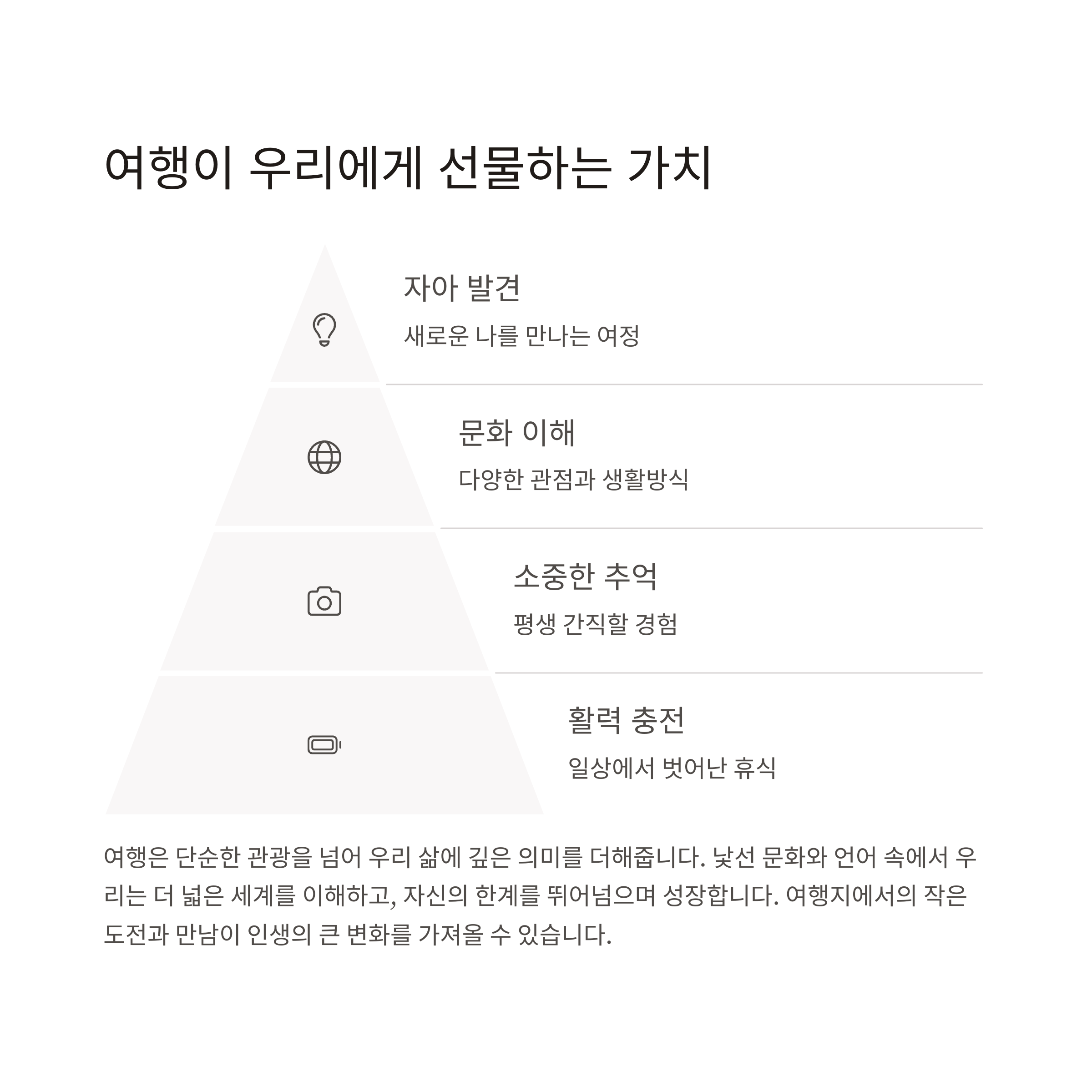 | 여행지 선정 기준 | 안전성, 풍경, 문화, 음식 등 다양한 요소 고려 |