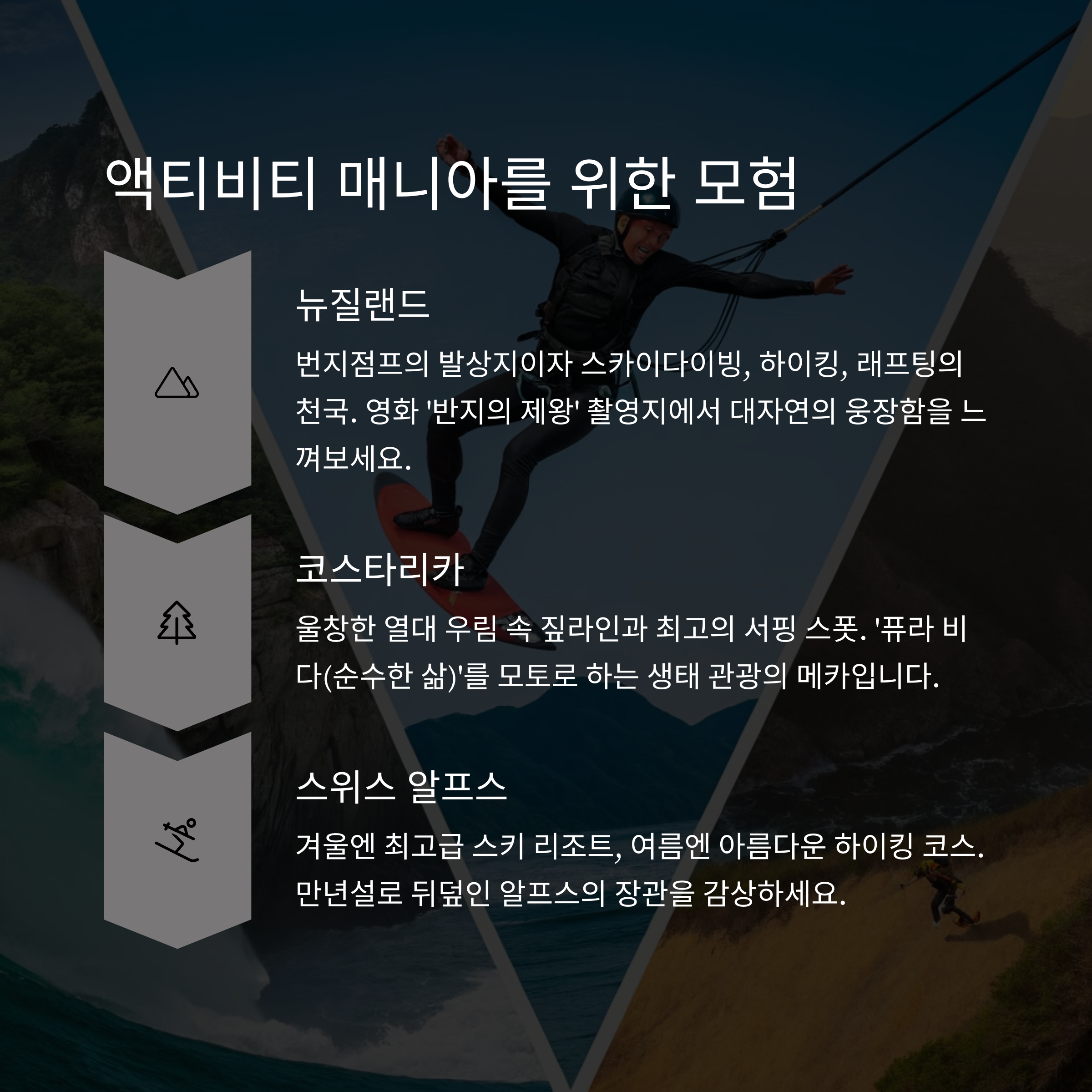 | 파리, 바르셀로나, 로마 등의 도시 감성 | 몰디브, 발리, 푸켓에서의 힐링 | 스위스 하이킹, 호주 서핑, 뉴질랜드 번지점프 |