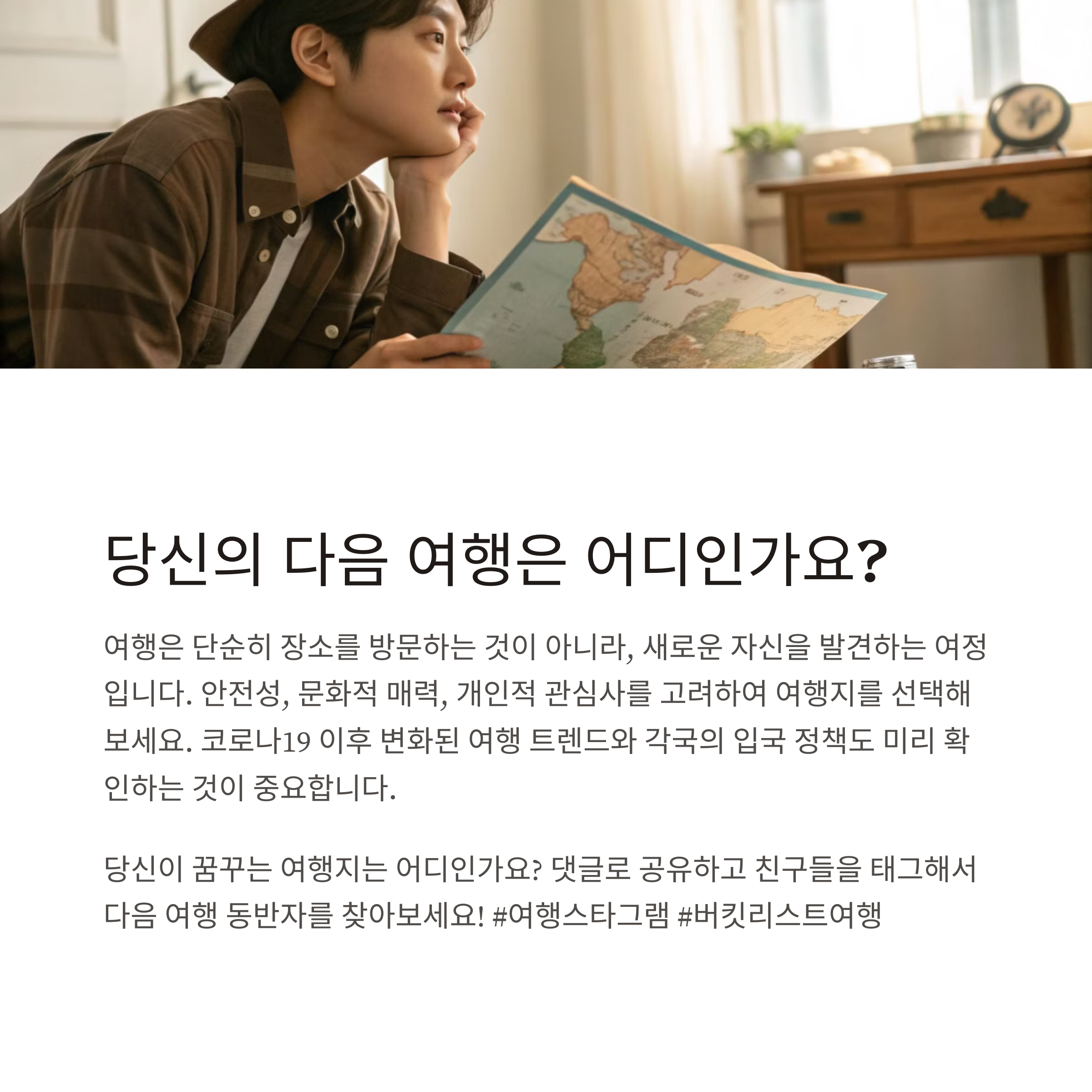 여행은 우리 삶에 새로운 리듬을 선물해 줍니다. 일상의 무게로부터 잠시 벗어나 다른 세상을 만나고, 새로운 사람들과 문화를 체험하면서 스스로를 돌아볼 기회를 얻게 되죠. 이번 글에서 소개한 여행지는 그저 멋진 풍경이 아닌, 마음을 울리는 감동이 있는 곳들입니다. 여행을 준비 중이라면, 이곳들을 리스트에 꼭 추가해보세요. 여행은 계획하는 그 순간부터 이미 시작된다고 합니다. 오늘의 이 정보가 여러분의 멋진 여행에 한걸음 더 다가가는 계기가 되기를 바랍니다.