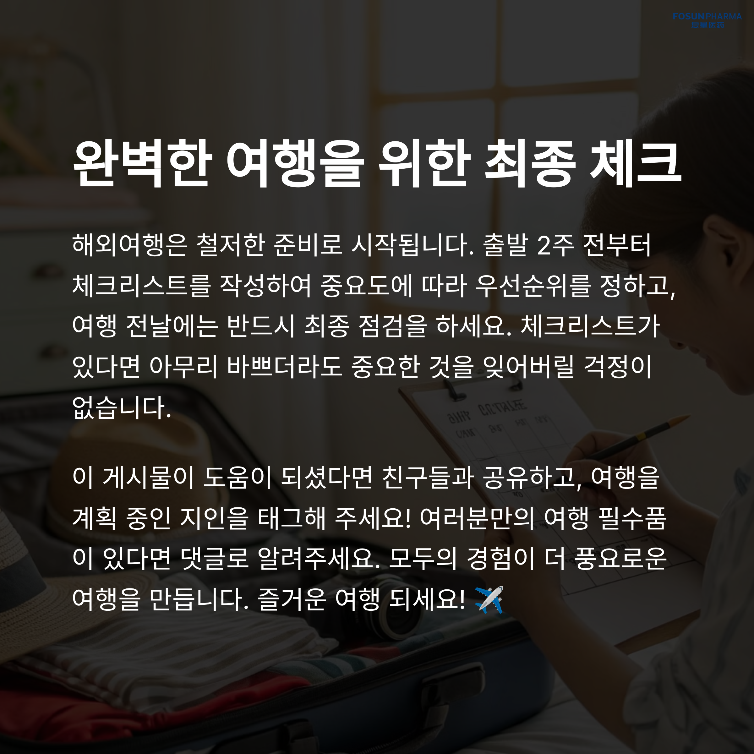 해외여행 준비는 많은 시간과 노력을 필요로 합니다. 하지만 꼼꼼한 준비를 통해 더 즐겁고 안전한 여행을 할 수 있습니다. 여권, 비자, 의약품, 금융 서류 등 필수 준비물들을 빠짐없이 체크하고, 여행을 떠나기 전 마지막 점검을 해보세요.