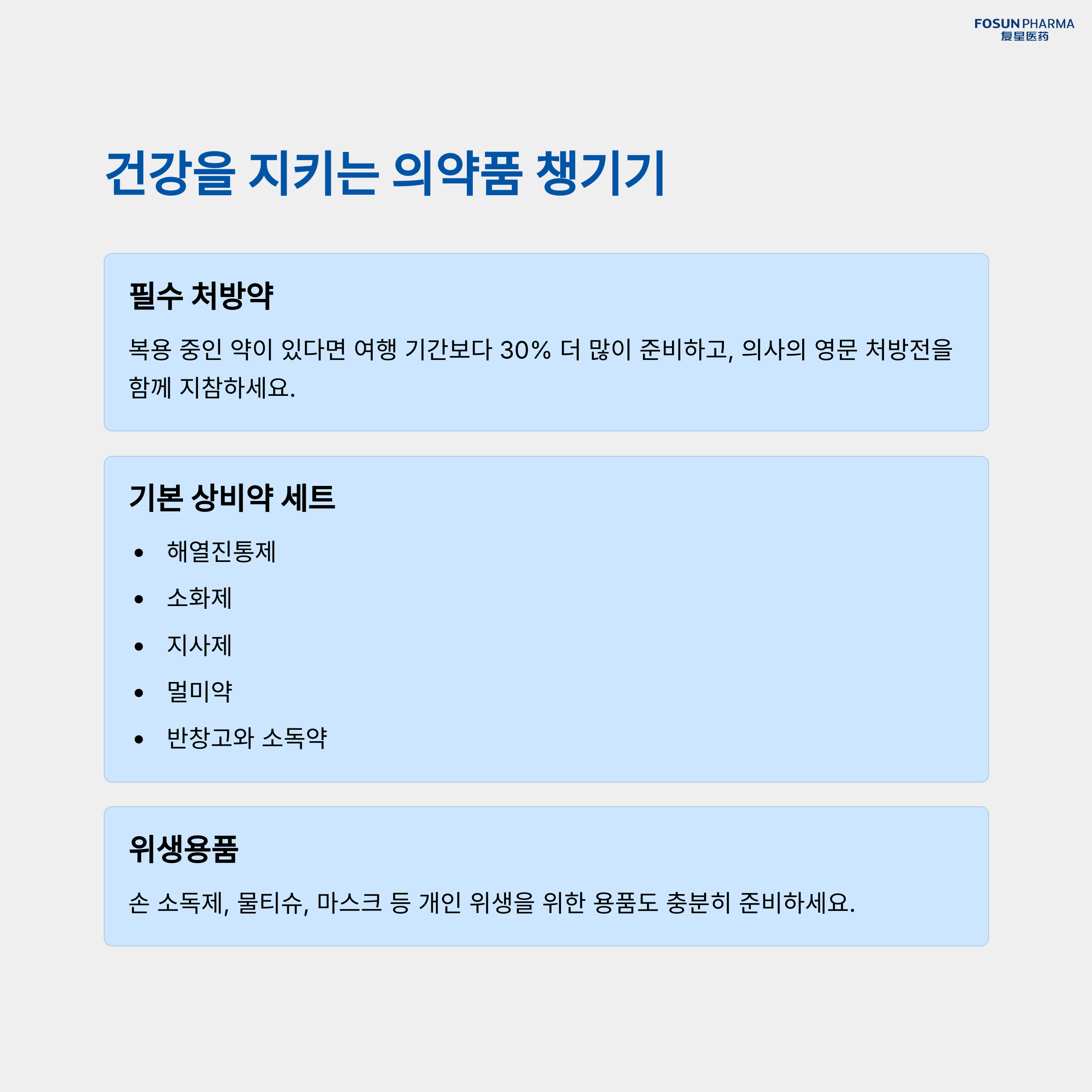 | 여권은 여행의 가장 중요한 서류입니다. | 일부 국가에서는 비자가 필요합니다. 사전 준비가 필수! | 개인 건강에 맞는 의약품을 준비해 두세요. |