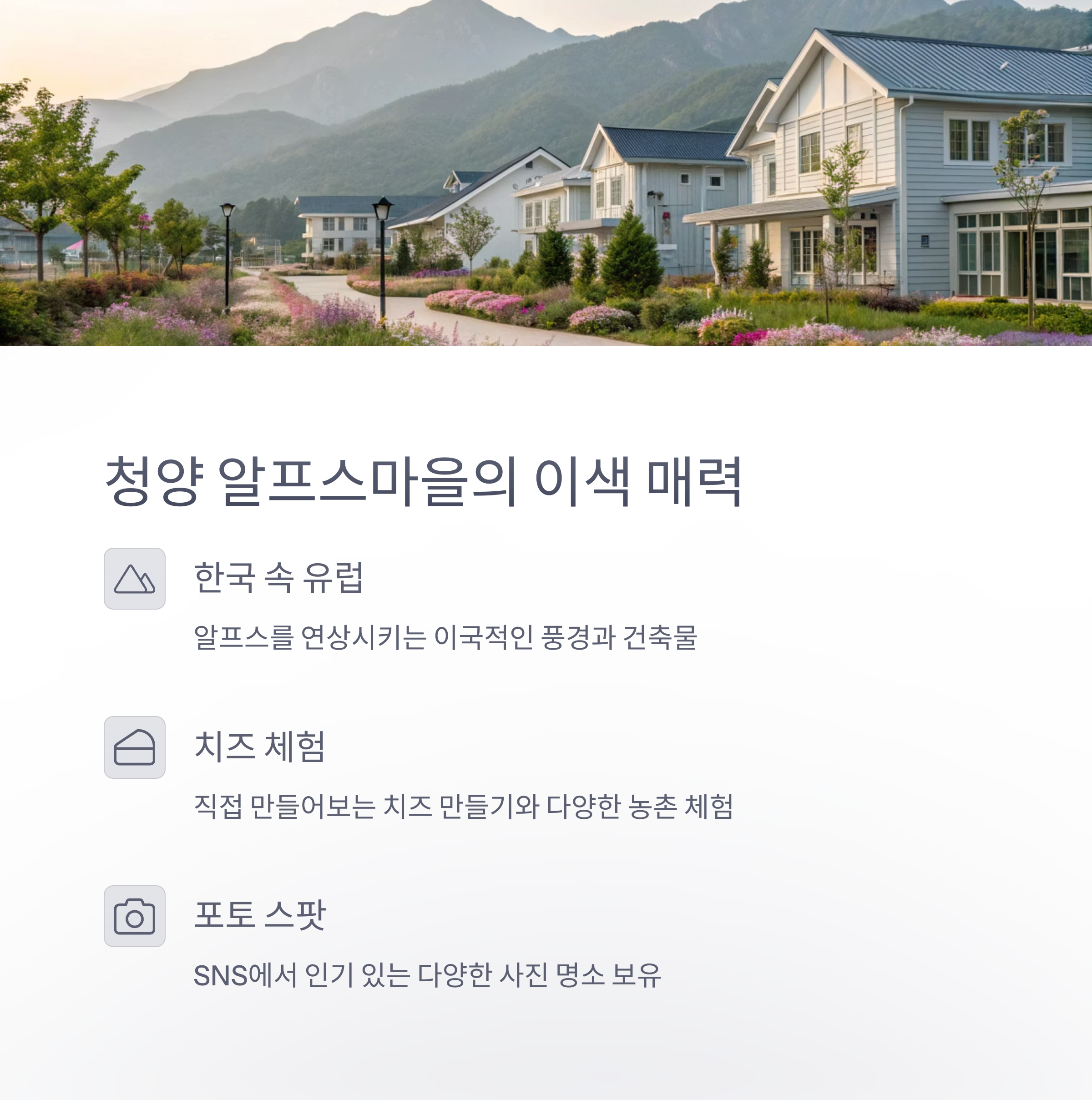 | 청양 | 알프스마을 | 농촌체험, 계곡물놀이 |