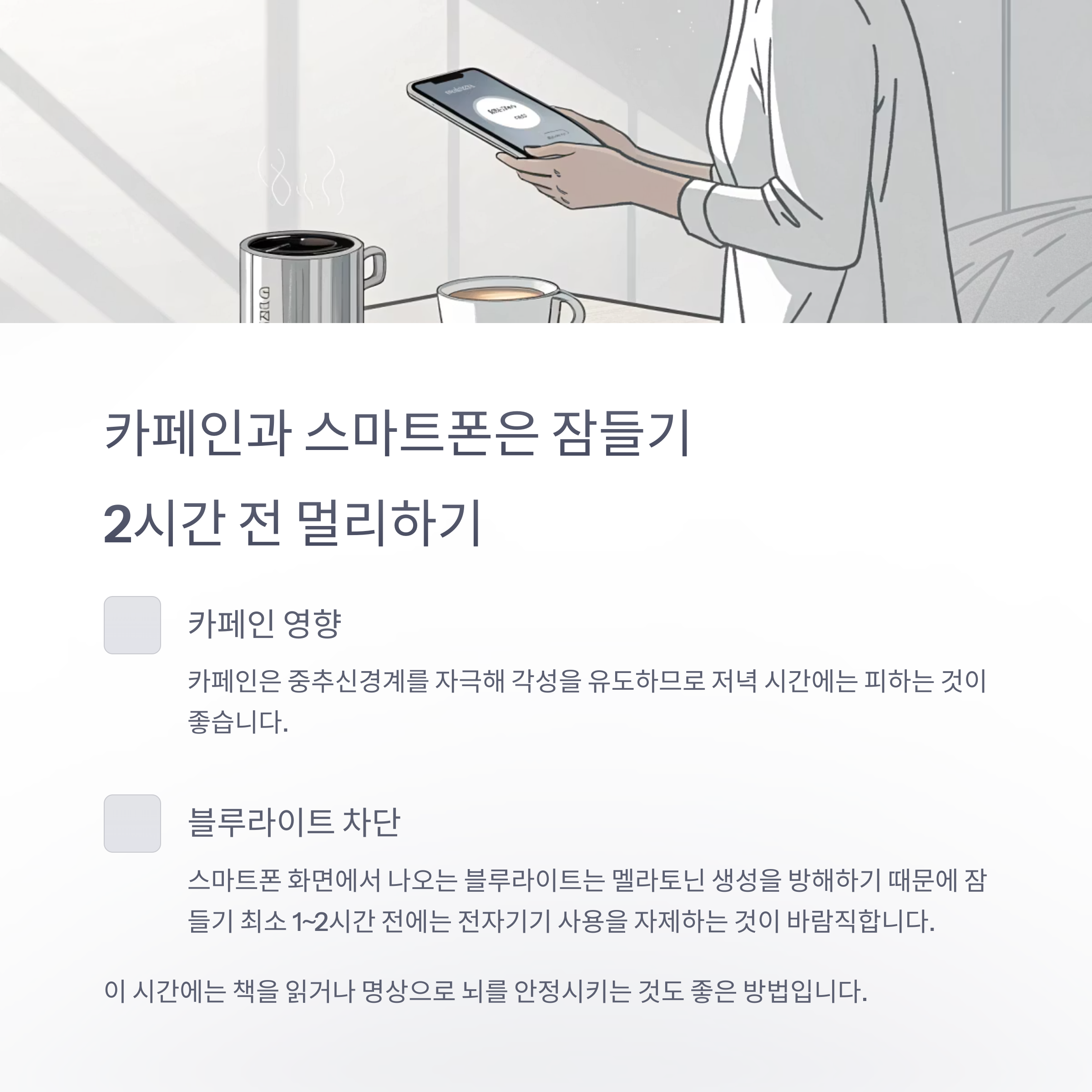 수면관리, 생활습관개선, 숙면환경, 천연수면유도제, 전자기기차단
