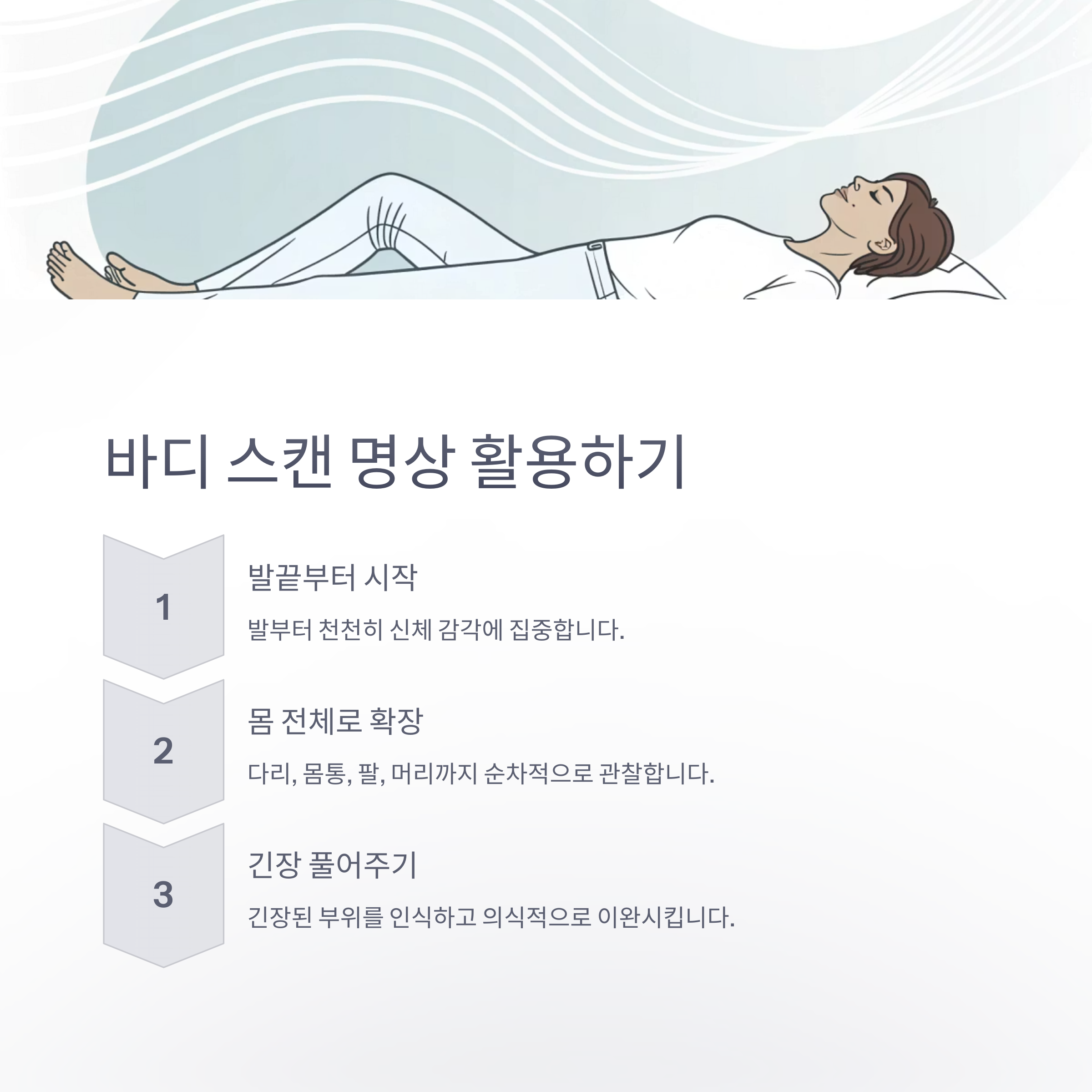 신체 감각에 집중하는 '바디 스캔 명상'은 초보자에게 효과적입니다.