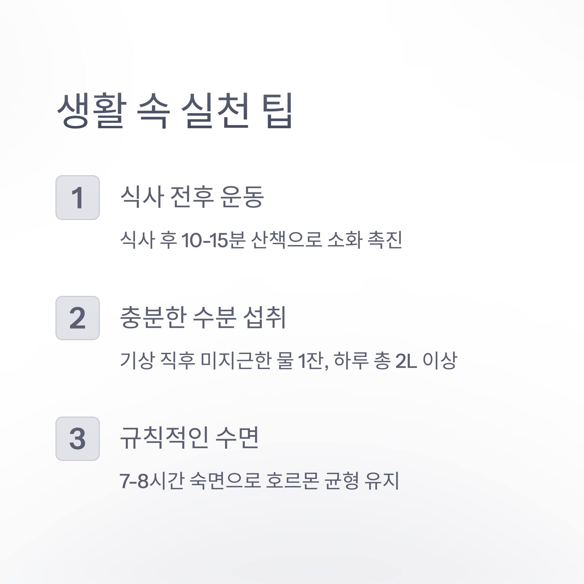 - 식사 전후 운동: 식사 후 10-15분 산책으로 소화 시키기