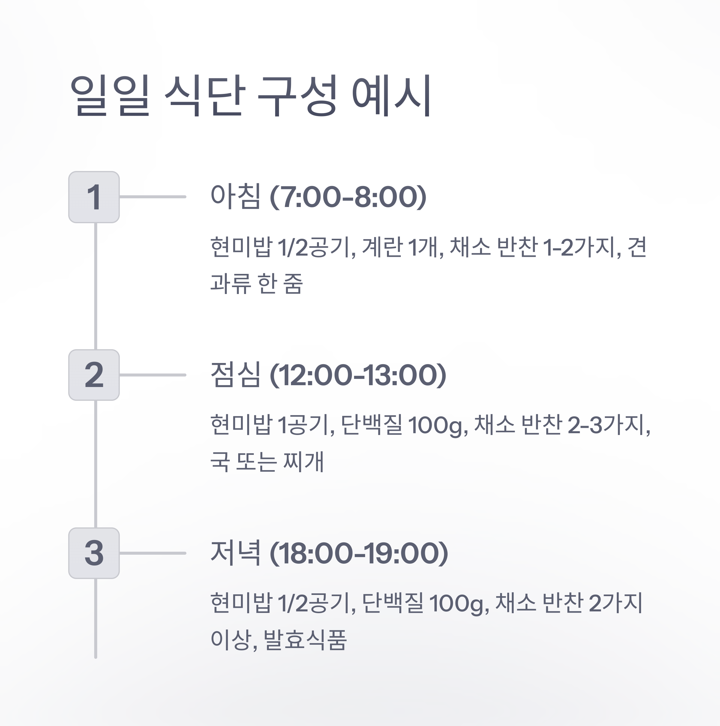 저녁: 가벼운 식사로 소화 부담을 줄이고 수면의 질 향상. 채소 중심의 식단을 권장합니다.