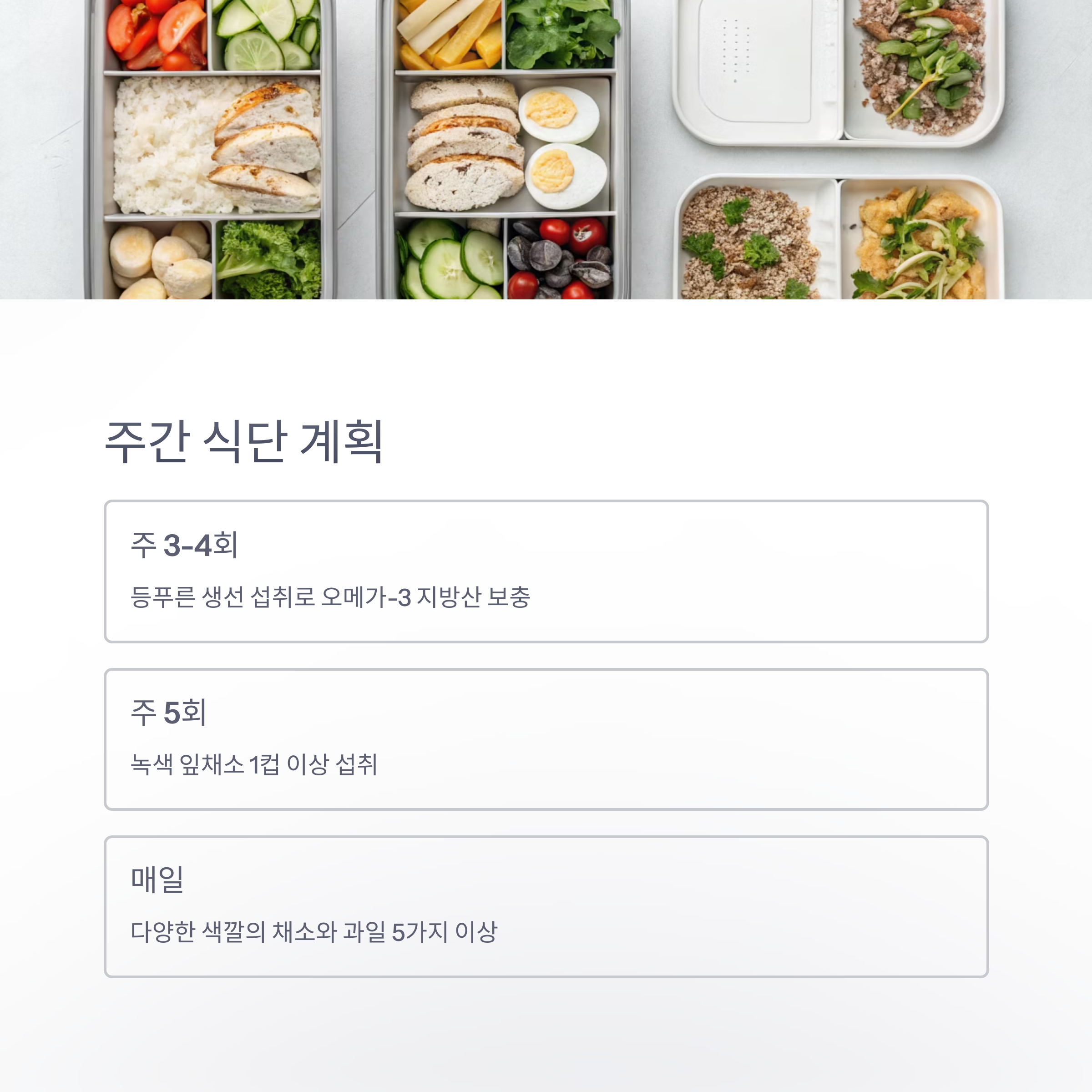 주 3-4회: 등푸른 생선 (고등어, 연어, 참치) 섭취로 오메가-3 지방산 보충