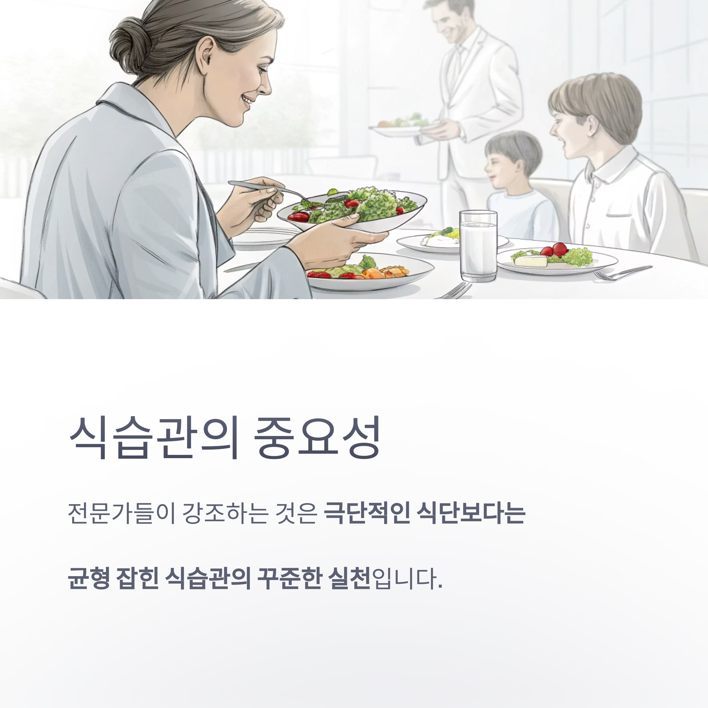 전문가들이 공통으로 강조하는 것은 극단적인 식단보다는 균형 잡힌 식습관의 꾸준한 실천입니다.